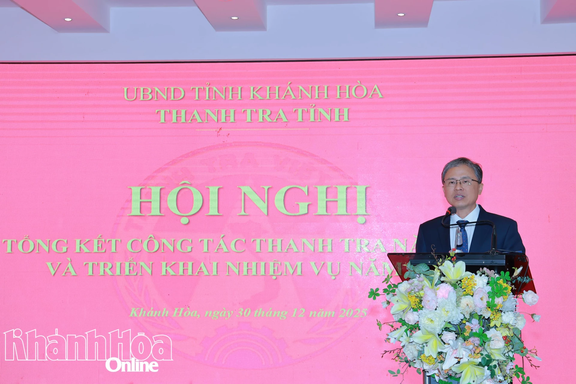 Phát biểu tại hội nghị, đồng chí Trần Hòa Nam đánh giá cao sự chủ động, quyết tâm và tinh thần trách nhiệm của tập thể lãnh đạo, toàn thể công chức và người lao động ngành thanh tra trong năm qua. Năm 2026, đồng chí yêu cầu ngành thanh tra tập trung 5 nhiệm vụ trọng tâm: Tiếp tục nâng cao chất lượng, hiệu quả công tác thanh tra, bảo đảm đúng trọng tâm, trọng điểm, không chồng chéo, gắn thanh tra với phòng ngừa vi phạm, tập trung vào các lĩnh vực, dự án lớn, chương trình, đề án trọng điểm của tỉnh; tham mưu UBND tỉnh trong công tác tiếp công dân, giải quyết đơn thư khiếu nại, tố cáo thuộc thẩm quyền; tham mưu UBND tỉnh chỉ đạo các cấp, ngành tiếp tục tổ chức quán triệt và triển khai thực hiện các chủ trương, giải pháp thực hiện pháp luật về phòng, chống tham nhũng, lãng phí, tiêu cực; tiếp tục rà soát, tham mưu hoàn thiện và thực thi có hiệu quả hệ thống pháp luật về thanh tra bảo đảm thống nhất với mô hình tổ chức mới; củng cố kiện toàn tổ chức bộ máy, rà soát, ban hành quy chế làm việc, quy trình nghiệp vụ.