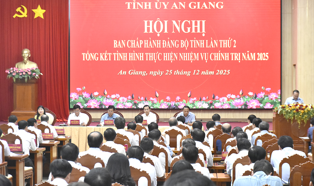 Chiều 25-12, Ban Chấp hành Đảng bộ tỉnh An Giang tổ chức hội nghị lần thứ 2 (mở rộng) để tổng kết tình hình thực hiện nhiệm vụ chính trị năm 2025 và đề ra Nghị quyết về phương hướng, nhiệm vụ năm 2026.
