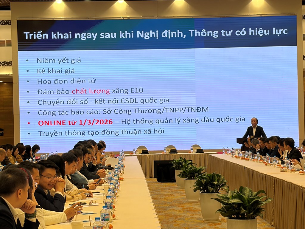 Phát biểu khai mạc hội nghị, ông Trần Hữu Linh, Cục trưởng Cục Quản lý và Phát triển thị trường trong nước nhấn mạnh, năm 2026 sẽ là năm đặc biệt với mặt hàng xăng dầu. Với dự thảo Nghị định kinh doanh xăng dầu sắp được ban hành cũng như việc chuyển đổi chủng loại xăng dầu, năm 2026 sẽ là năm bước ngoặt, có những thay đổi cơ bản, là năm cách mạng với mặt hàng xăng dầu.