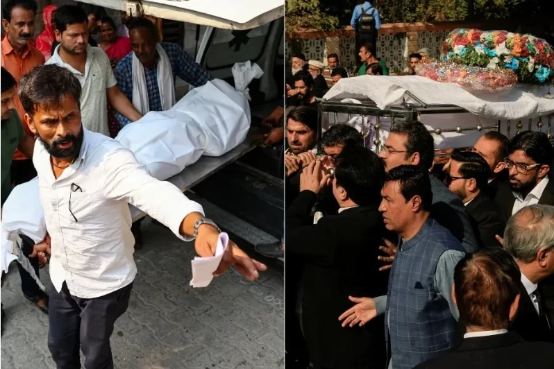 Bên trái: Người dân khiêng thi thể của Pankaj Sahni, người đã thiệt mạng trong vụ nổ chết người ở New Delhi; Bên phải: Các luật sư khiêng quan tài của Zubair Aslam Ghuman, một luật sư đã thiệt mạng trong vụ nổ ở Islamabad. Ảnh: Reuters.