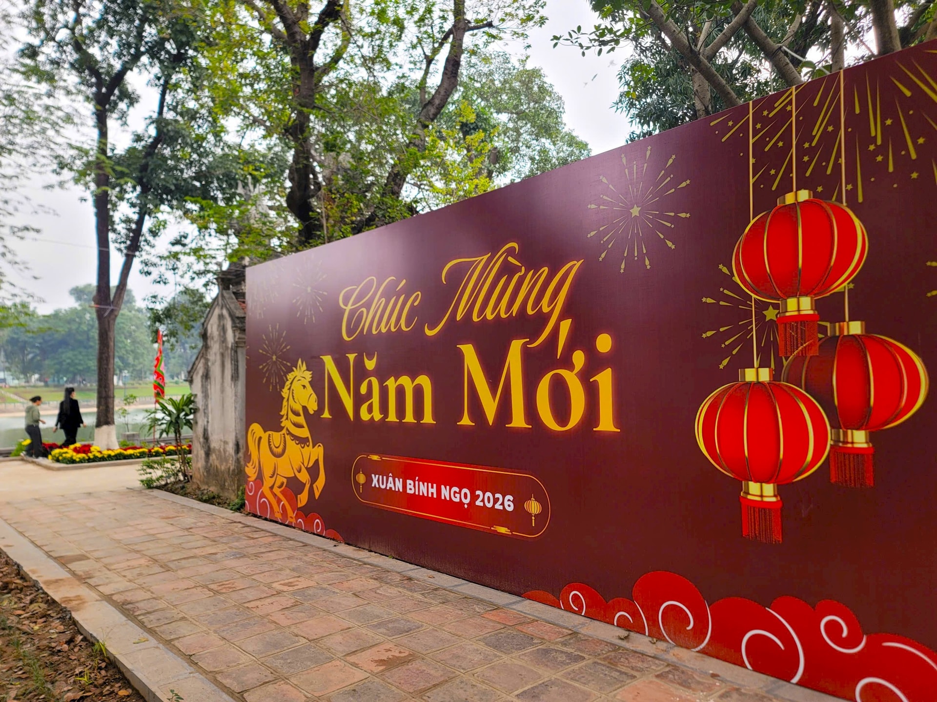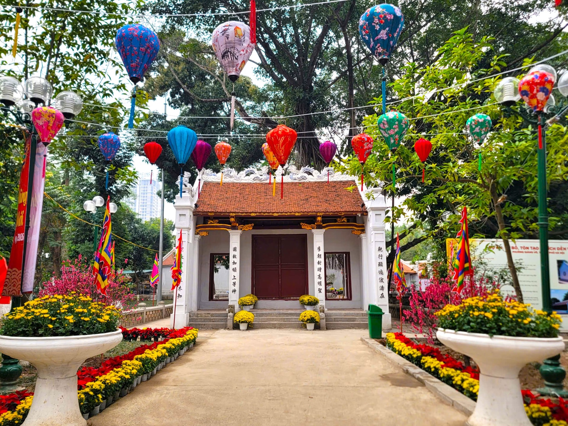 Bên ngoài khuôn viên đền Voi Phục, UBND phường Giảng Võ đã huy động xã hội hóa tạo lập “Không gian sắc xuân Tây Trấn”, “Không gian văn hóa Trà Việt”. Ảnh: MH