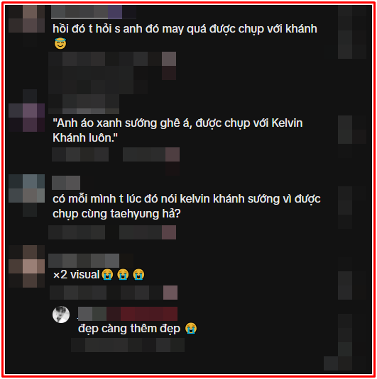 Khi cư dân mạng "đào" lại bức ảnh này, nhiều người bất ngờ nhận ra Kelvin Khánh và V có ngoại hình giống nhau đến khó tin. Ở góc chụp từ trên xuống, cả hai được nhận xét như "anh em song sinh" với gương mặt điển trai, làn da sáng và kiểu tóc đậm chất idol Hàn Quốc. Thời điểm đó, không ít khán giả còn dành lời khen cho Kelvin Khánh, cho rằng nhan sắc của nam ca sĩ chẳng khác nào mỹ nam Kpop.