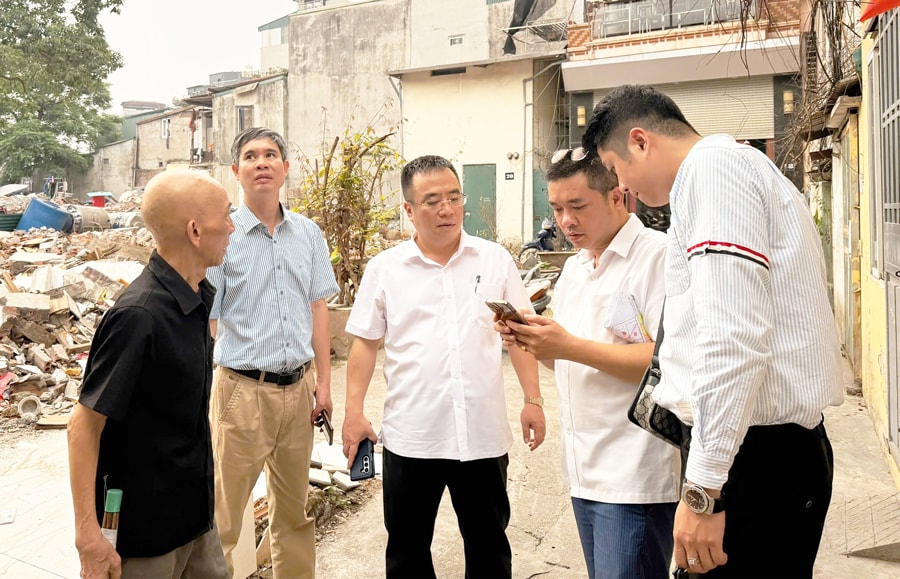 Phó Bí thư Đảng ủy, Chủ tịch UBND phường Khương Đình Nguyễn Sỹ Đoàn trực tiếp xuống địa bàn, tổ chức gặp gỡ, đối thoại với các hộ dân thuộc diện thu hồi đất để triển khai dự án đường Vành đai 2.5. Ảnh: HT