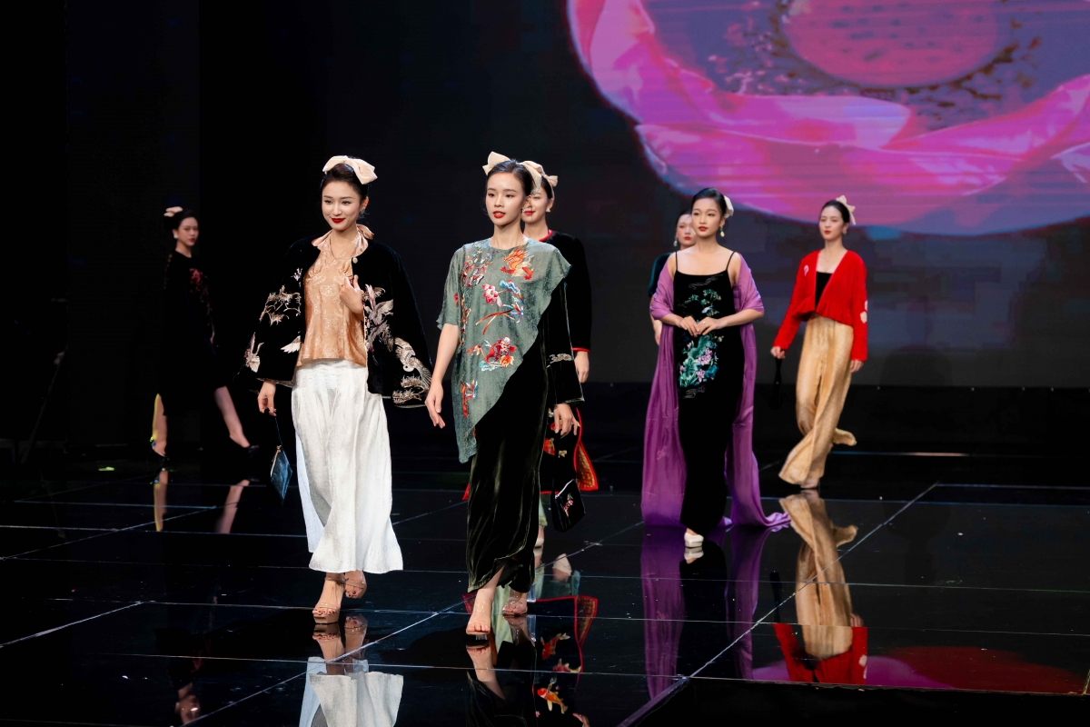 Các người mẫu nữ thướt tha trong những thiết kế áo dài nhung, thể hiện tinh thần “Tơ xưa”.