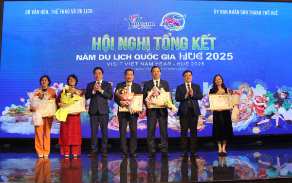 Tại Hội nghị, Bộ VH-TT&DL đã trao tặng bằng khen cho 7 tập thể, 8 cá nhân và Chủ tịch UBND TP Huế tặng bằng khen nhiều tập thể, cá nhân có thành tích xuất sắc trong công tác tổ chức Năm Du lịch quốc gia - Huế 2025. Đồng thời lãnh đạo Bộ VH-TT&DL và UBND TP Huế đã trao cờ Năm Du lịch quốc gia cho UBND tỉnh Gia Lai đăng cai Năm Du lịch quốc gia 2026.
