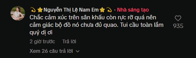 Trước những ý kiến trái chiều, nữ ca sĩ đã lên tiếng giải thích trên trang cá nhân với thái độ hài hước: “Chắc cảm xúc trên sân khấu còn rực rỡ quá nên cảm giác bộ đồ chưa đủ ‘quao’. Tui cầu toàn lắm quý vị ơi”. Lời chia sẻ của cô nhận được sự đồng cảm từ nhiều người hâm mộ, cho rằng việc một nghệ sĩ muốn chỉn chu trong mỗi lần xuất hiện là điều đáng trân trọng.