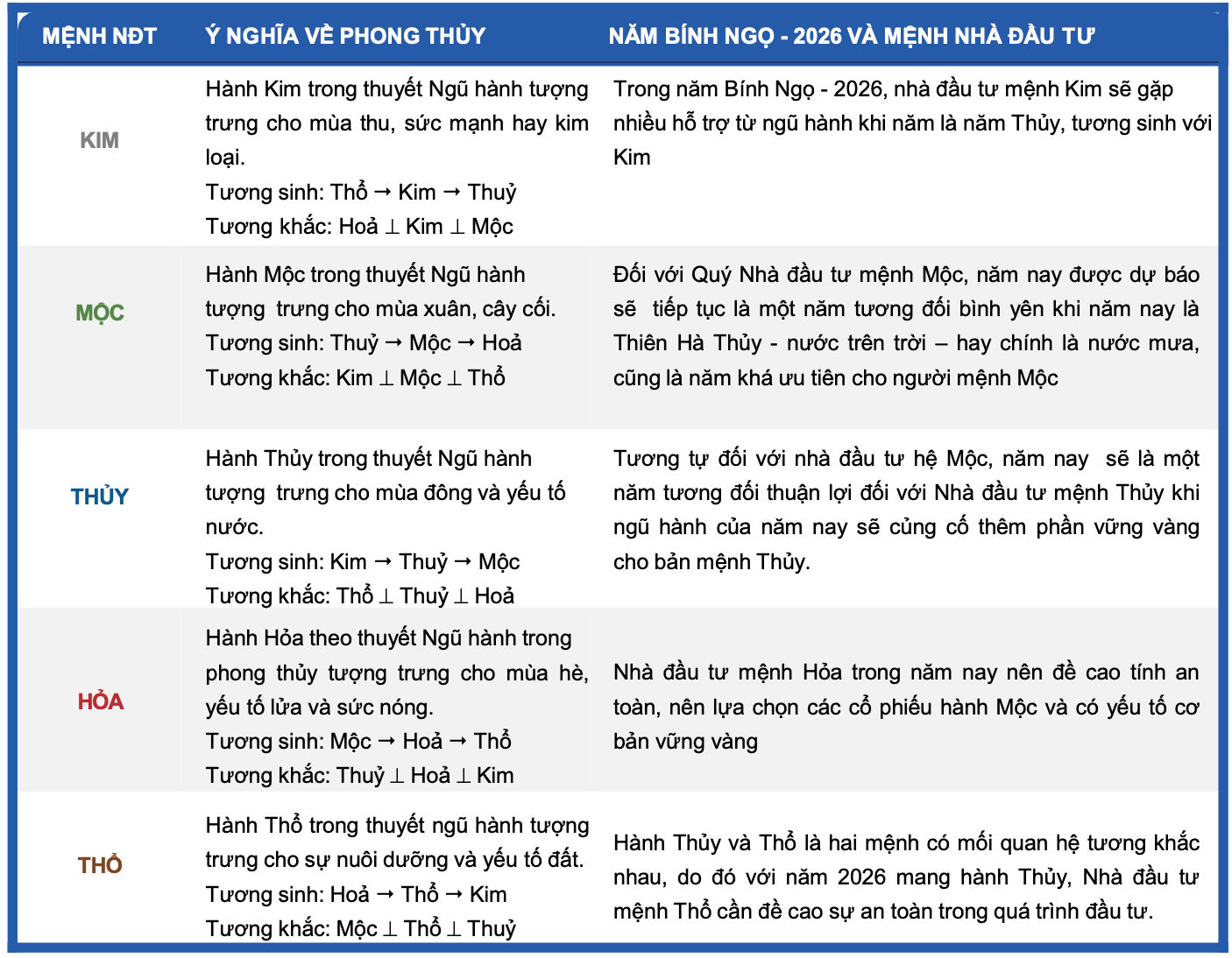 Tóm lại, tổng cộng có 10 mã cổ phiếu được khuyến nghị trong danh mục đầu tư theo phong thủy ngũ hành năm Bính Ngọ 2026 của BSC. Ngoài ra, theo từng mệnh, ứng với phong thủy năm Bính Ngọ 2026, BSC cũng đưa ra các phân tích về sự phù hợp, thuận lợi, hoặc mối quan hệ tương khắc cần đề cao sự an toàn (ảnh dưới).