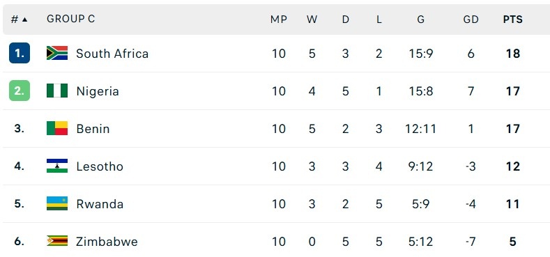 Tin vui liên tiếp bay đến giúp Nam Phi thi đấu thăng hoa ở trận cùng giờ. Chủ nhà World Cup 2010 đánh bại Rwanda 3-0 trên sân nhà để chiếm ngôi đầu với 18 điểm và cũng là tấm vé đến thẳng châu Mỹ từ tay Benin. Thậm chí, Benin (17 điểm - hiệu số 1) còn tụt xuống thứ 3, sau Nigeria (17 điểm - hiệu số 7) và không còn bất kỳ cơ hội nào để dự ngày hội bóng đá lớn nhất hành tinh diễn ra vào năm sau.