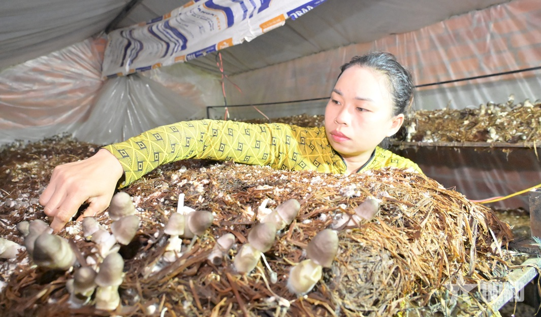 Chị Lê Thị Hồ Linh kiểm tra sự phát triển của nấm rơm sạch.