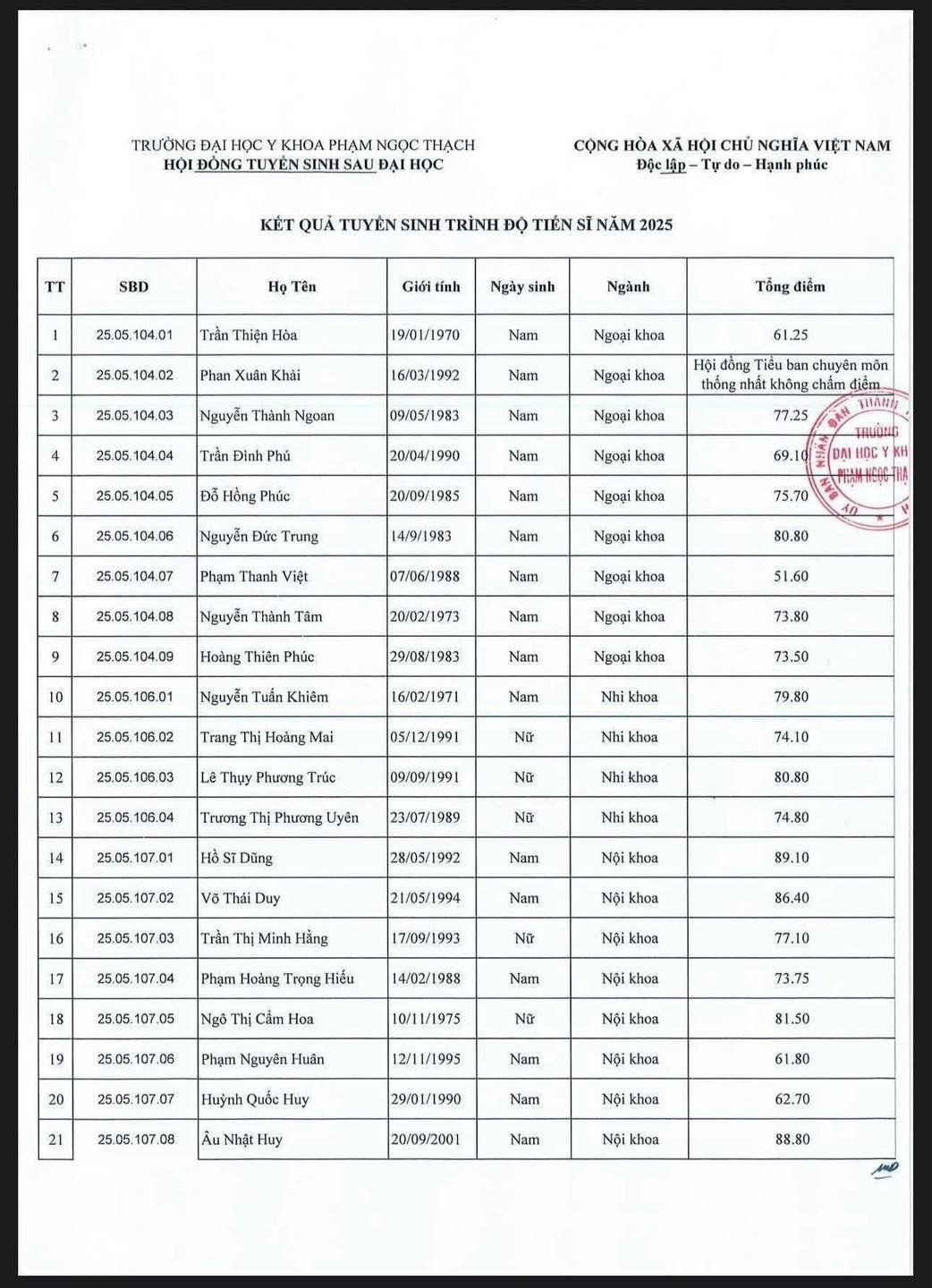 Trường Đại học Y khoa Phạm Ngọc Thạch vừa công nhận 25 thí sinh trúng tuyển nghiên cứu sinh năm 2025, gồm 7 ở ngành ngoại khoa, 4 ở nhi khoa, 11 ở nội khoa và 3 ở tai - mũi - họng.
