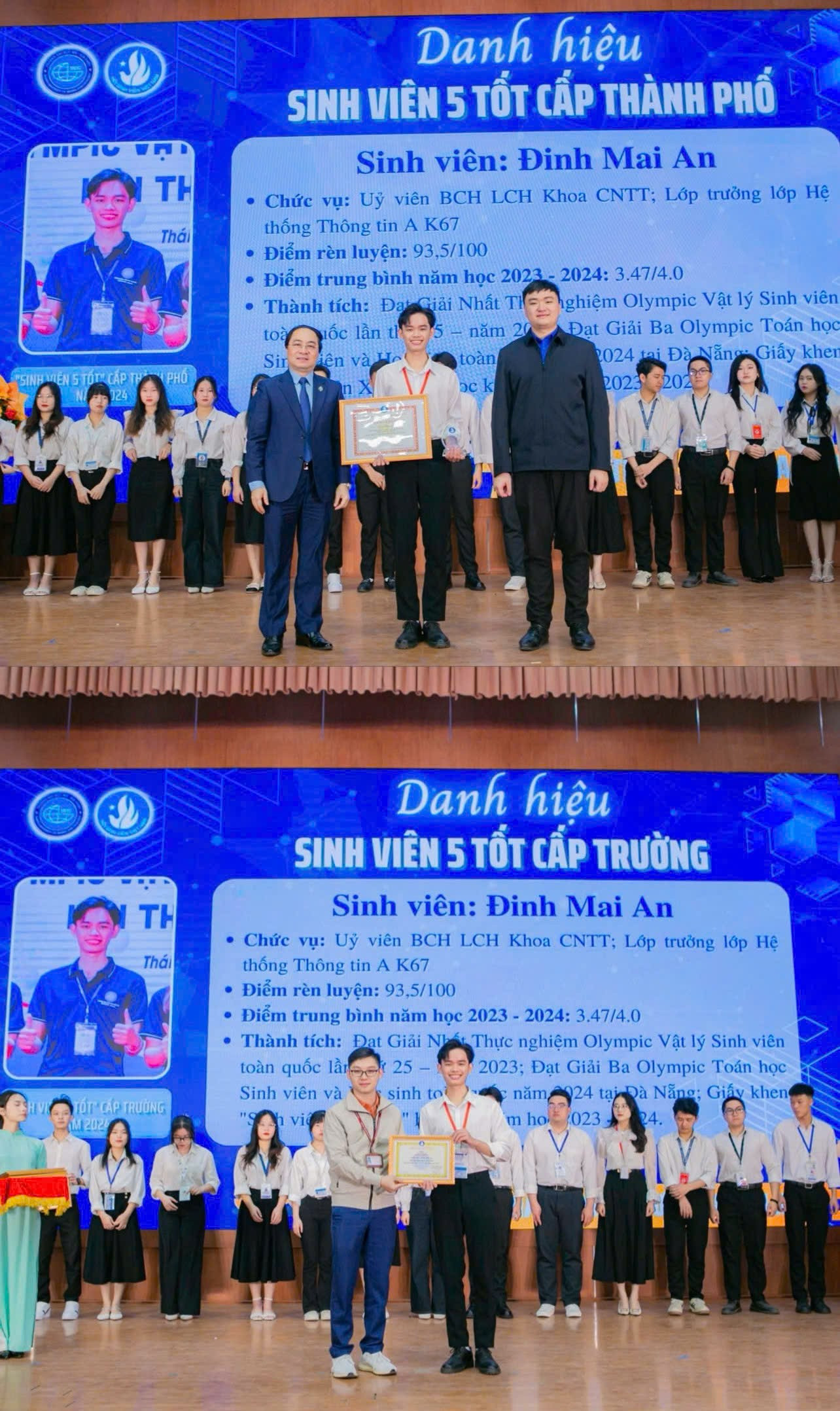 Với Mai An, danh hiệu “Sinh viên 5 tốt” cấp Thành phố Hà Nội 2024 không chỉ là phần thưởng cho nỗ lực cá nhân mà còn là dấu mốc ghi nhận hành trình rèn luyện toàn diện trong suốt những năm đại học. Anh chia sẻ: “Cân bằng giữa học tập, nghiên cứu và hoạt động Đoàn - Hội chưa bao giờ dễ. Có lúc vừa làm bài tập lớn, vừa chuẩn bị thi học thuật, lại phải tham gia tổ chức sự kiện. Mình luôn cố gắng lập kế hoạch rõ ràng, sắp xếp ưu tiên hợp lý và giữ tinh thần chủ động trong mọi việc”.