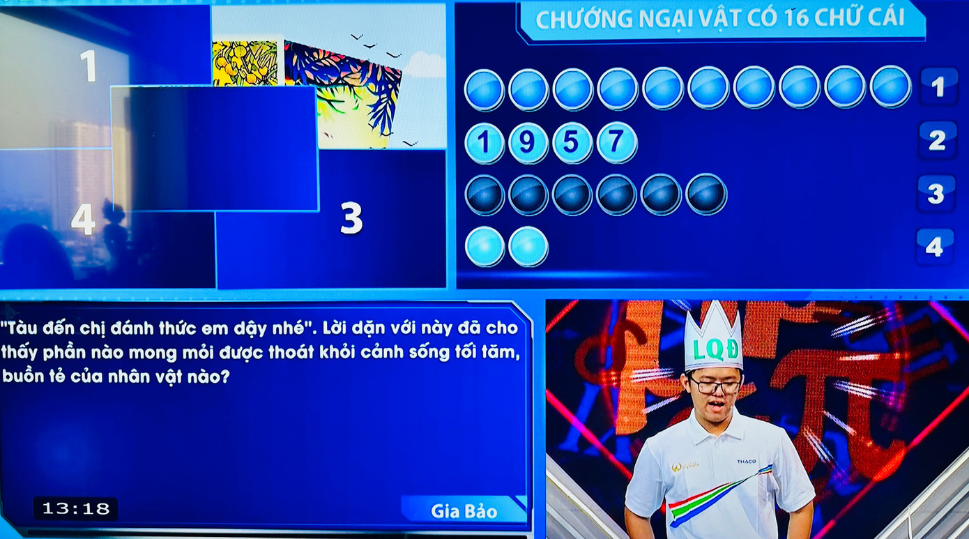 Câu hỏi này xuất hiện, Gia Bảo liền nhấn chuông trả lời ẩn số chướng ngại vật và đưa ra đáp án chính xác: “Đất rừng phương Nam”. Điều này đã giúp nam sinh Khánh Hòa từ vị trí cuối đoàn đua vươn lên thứ hai.
