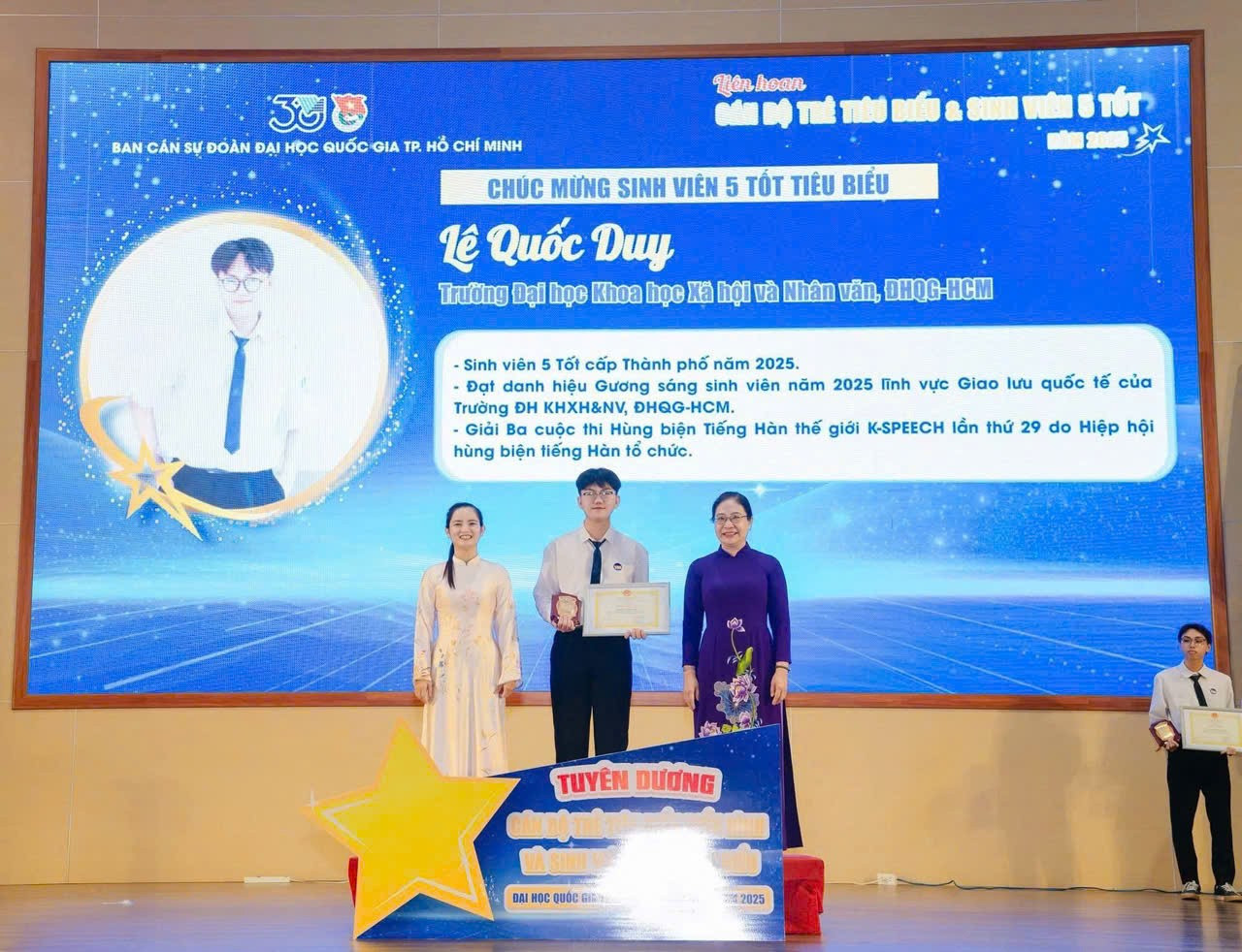 Lê Quốc Duy vinh dự nhận Danh hiệu 'Sinh viên 5 tốt' cấp Thành phố, năm 2025.