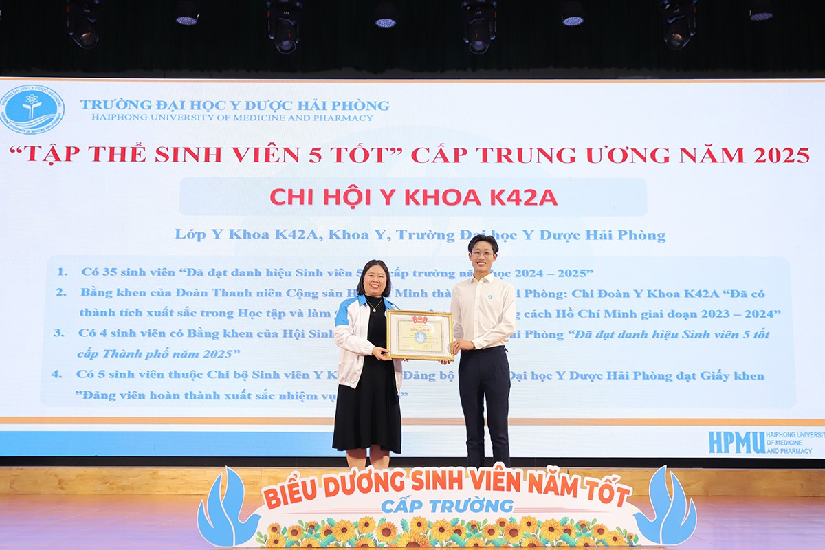 Lê Xuân Tiến đại diện Chi hội Y khoa K42A nhận bằng khen “Tập thể Sinh viên 5 Tốt” cấp Trung ương năm 2025.