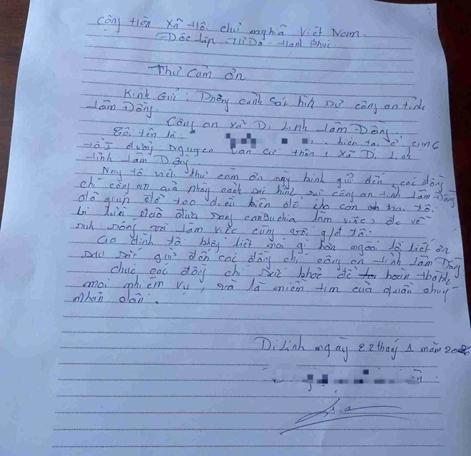 Gia đình nạn nhân gửi thư cảm ơn Phòng Cảnh sát hình sự Công an Lâm Đồng. Ảnh: CACC