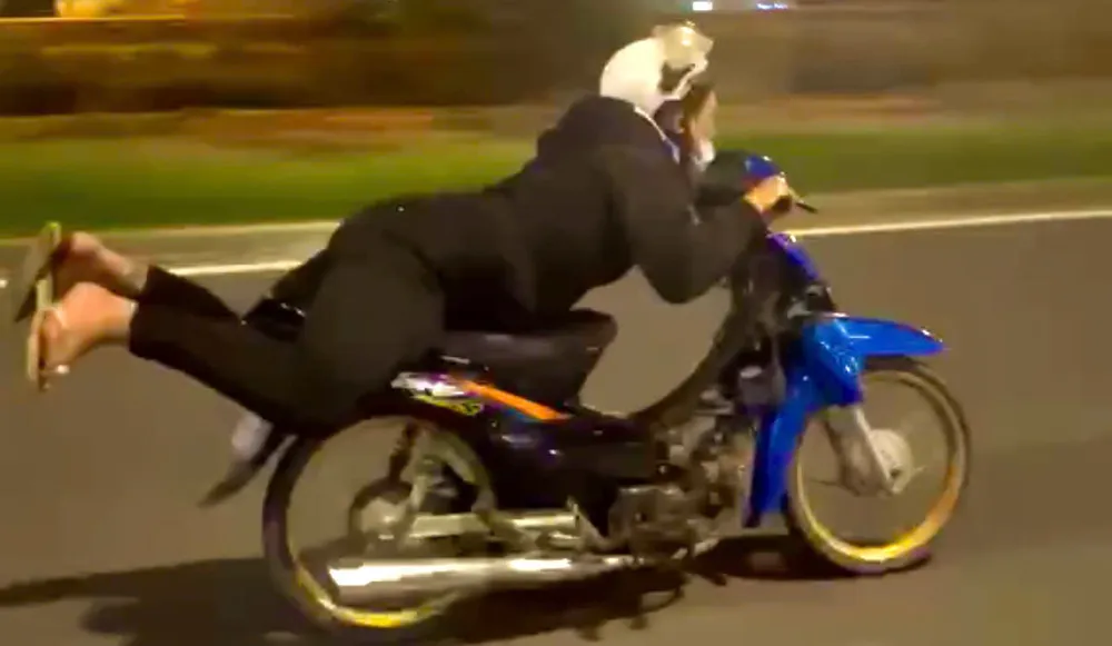 Mới đây, mạng xã hội lan truyền clip ghi cảnh một nam thanh niên điều khiển xe máy nằm sấp trên yên xe, thân người duỗi dài, hai tay nắm chặt tay lái, hai chân duỗi thẳng ra phía sau.
