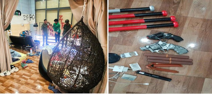 Từ dấu hiệu bất thường, công an kiểm tra ngôi nhà do Nguyễn Minh Sang (20 tuổi) thuê để sinh sống. Kết quả, công an thu giữ tang vật gồm 1 khẩu súng bằng kim loại màu đen; 1 khẩu súng bằng kim loại màu đen - bạc; 2 vỏ đạn bằng kim loại màu vàng đồng; 5 dao kép có vỏ nhựa, bằng kim loại; 5 gậy bóng chày bằng kim loại.