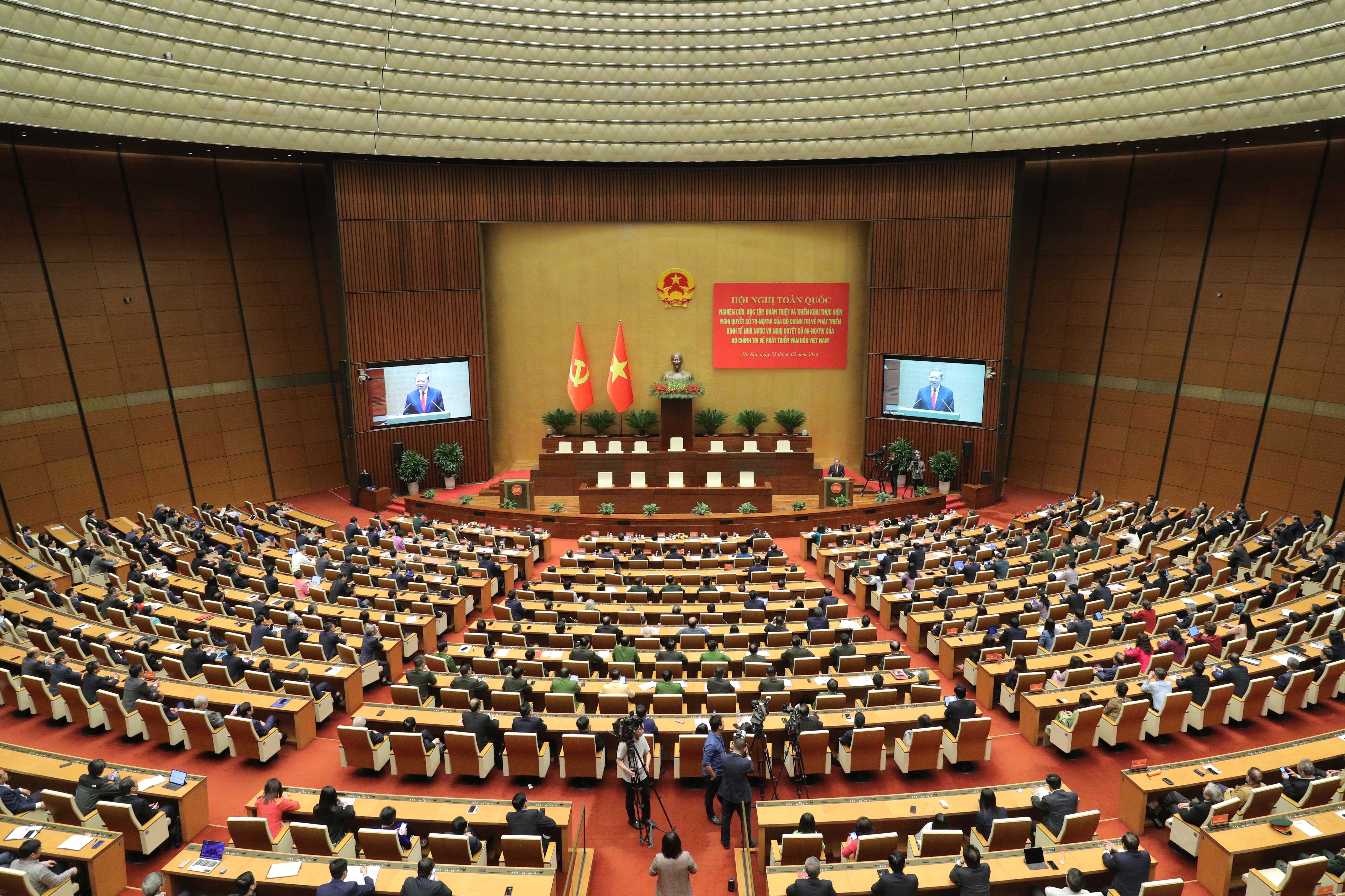 Quang cảnh Hội nghị toàn quốc quán triệt, triển khai thực hiện Nghị quyết số 79-NQ/TW và Nghị quyết số 80-NQ/TW. Ảnh: Hồ Long
