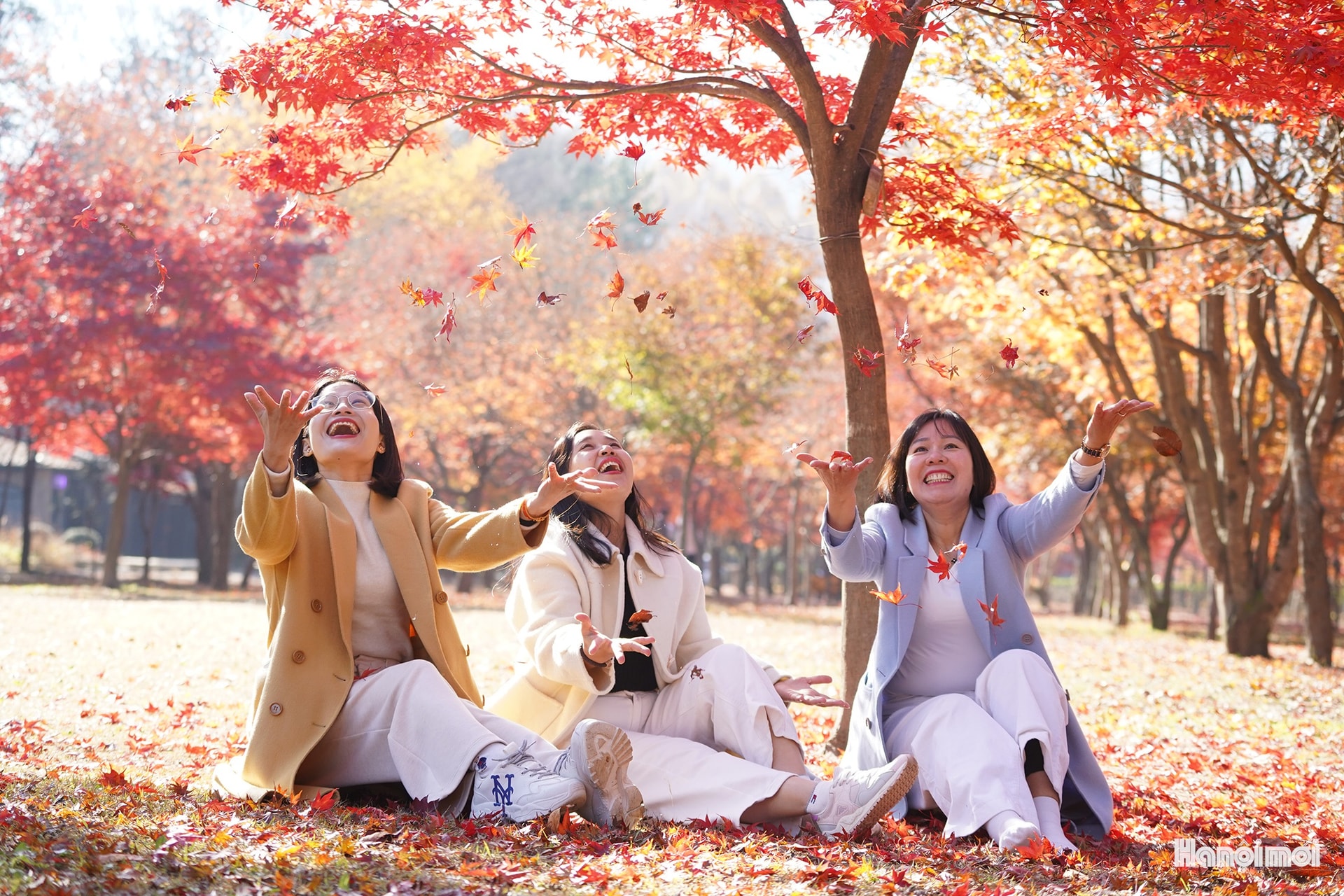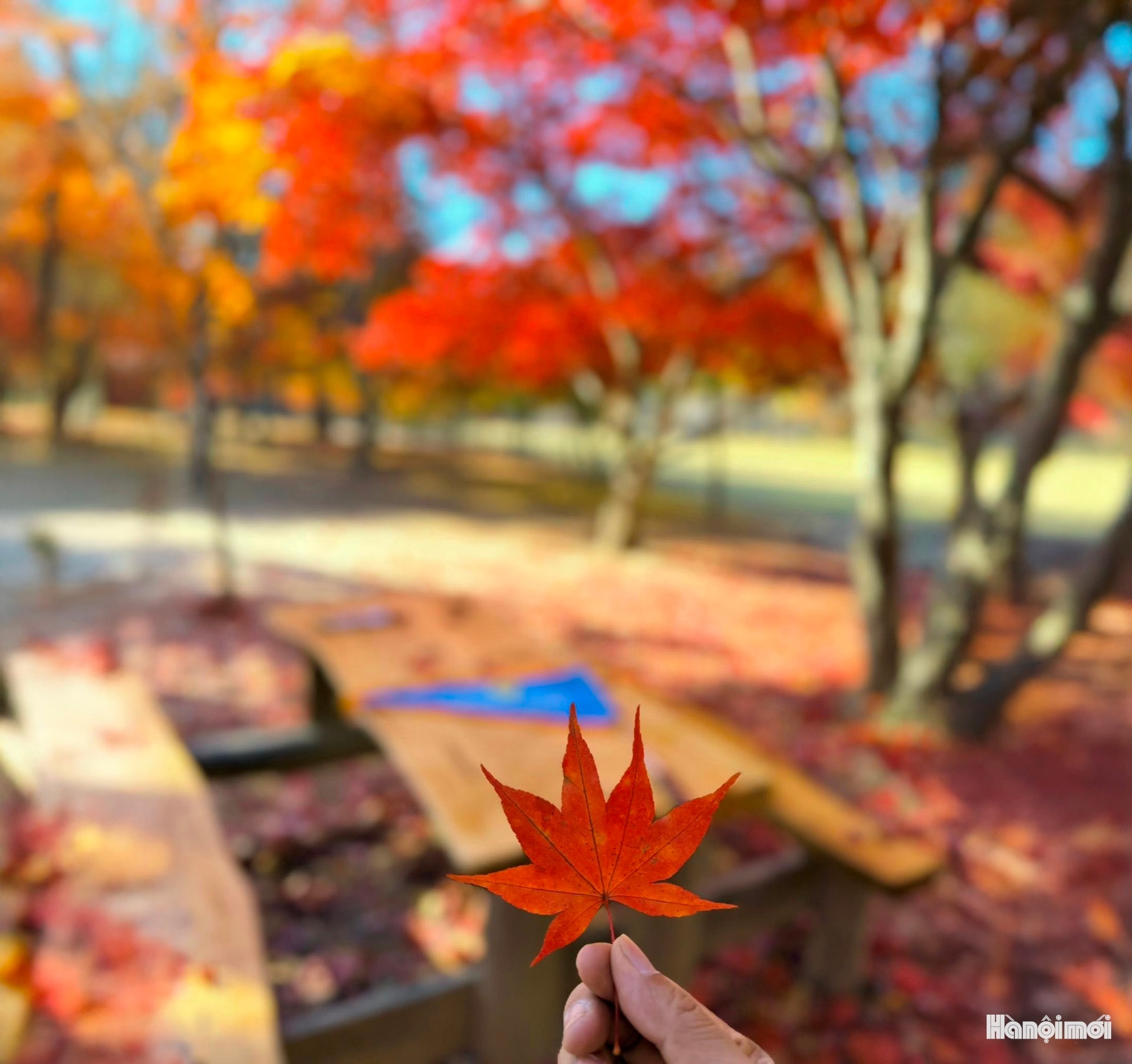 Nhiều du khách hòa mình dưới gốc phong lá đỏ, để được hòa mình trong khung cảnh thiên nhiên lãng mạn.