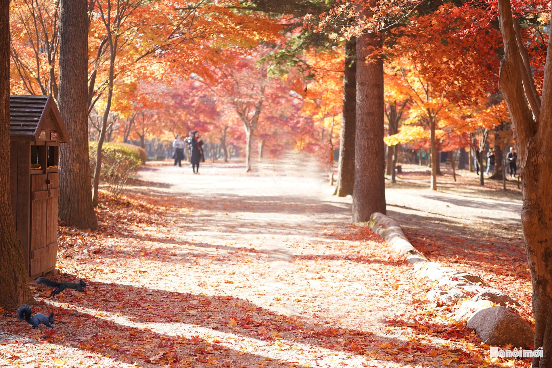 Trên con đường mùa thu được tô điểm bằng những chú sóc nhỏ nhảy nhót kiếm ăn tạo nên không gian thanh bình và thơ mộng.