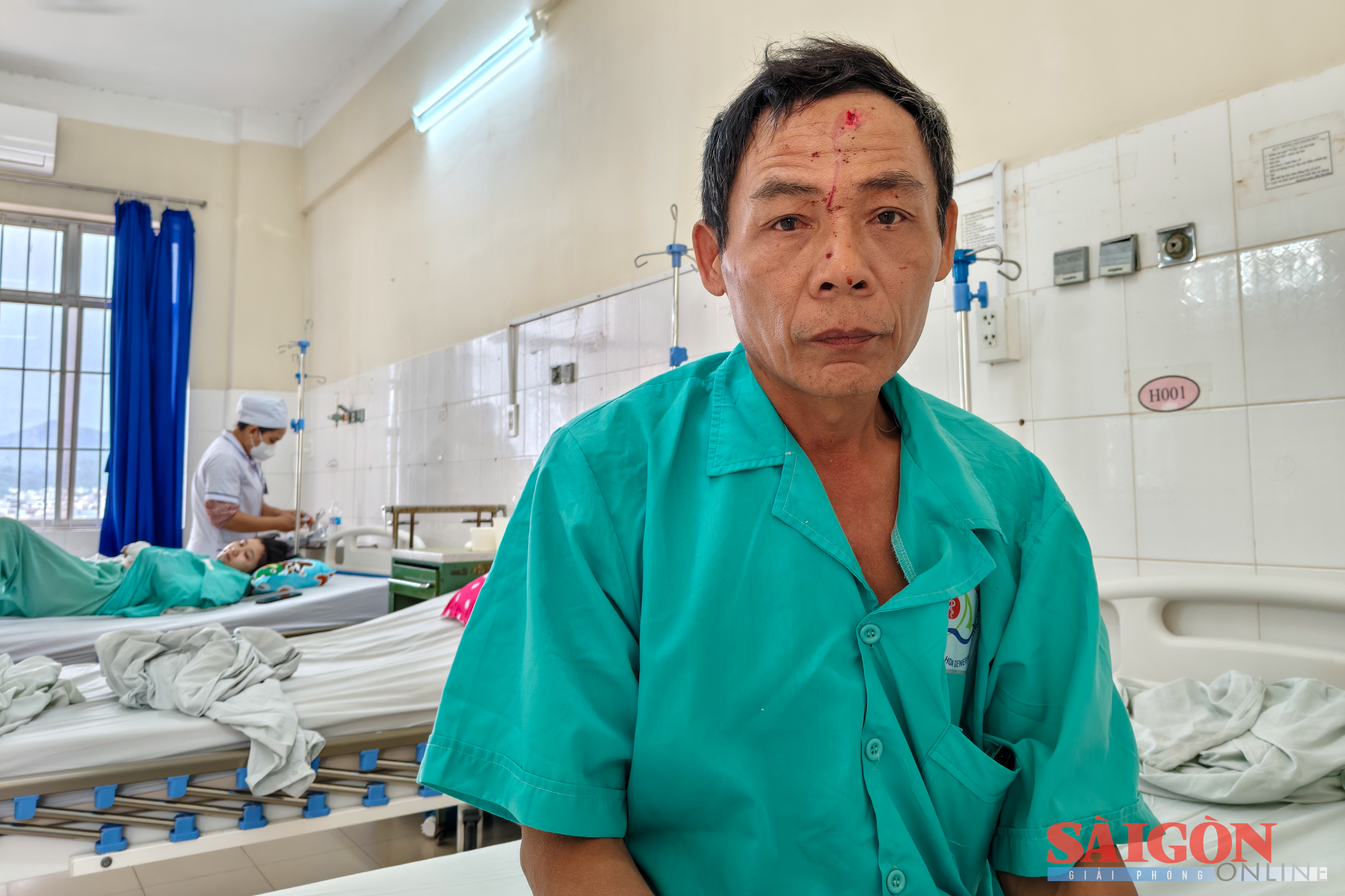Ông Nguyễn Văn Từ với vết thương trên trán do mảnh vỡ từ xe văng trúng. Ảnh: HIẾU GIANG