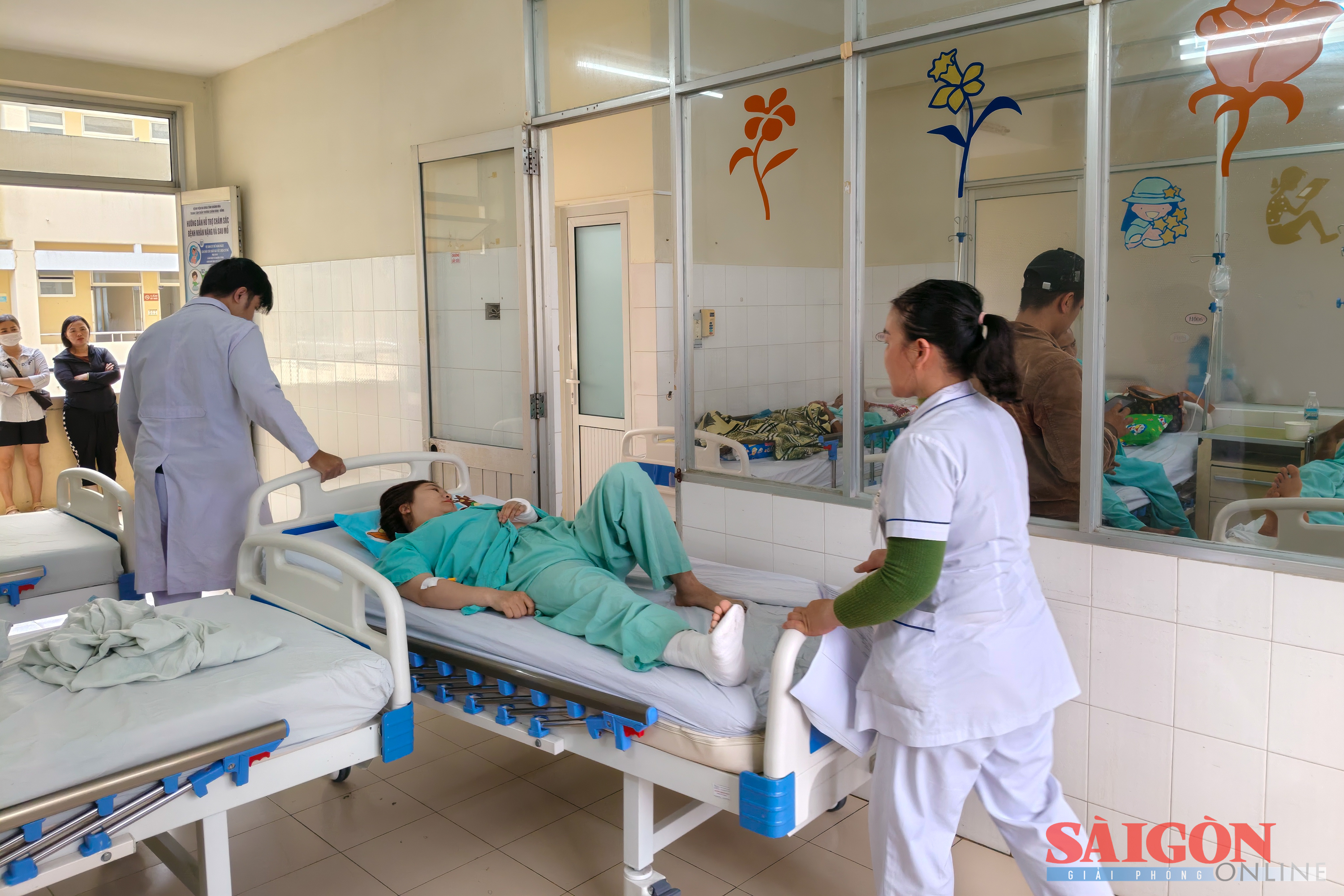 Nằm điều trị ở khu B bệnh viện, chị Trương Thị Mỹ Linh (28 tuổi, trú tỉnh Quảng Ngãi) bị gãy xương cánh tay trái, chồng chị gãy chân.