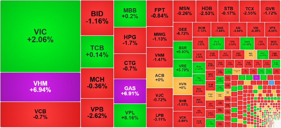Với sức mạnh chính từ nhóm cổ phiếu Vin, cộng thêm GAS kịch trần, đã đem về tới hơn 20 điểm. Điều này đồng nghĩa với số còn lại giảm rất đáng kể mới khiến VN-Index tăng chung cuộc chưa tới 4 điểm.