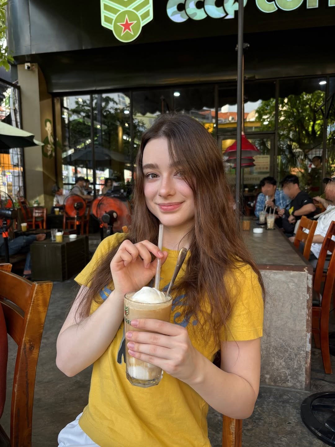 Trong các bức ảnh, Dasha Taran xuất hiện tại một quán cà phê mang phong cách ngoài trời, thưởng thức một ly nước giải khát có kem mát lạnh. (Ảnh: IGNV)