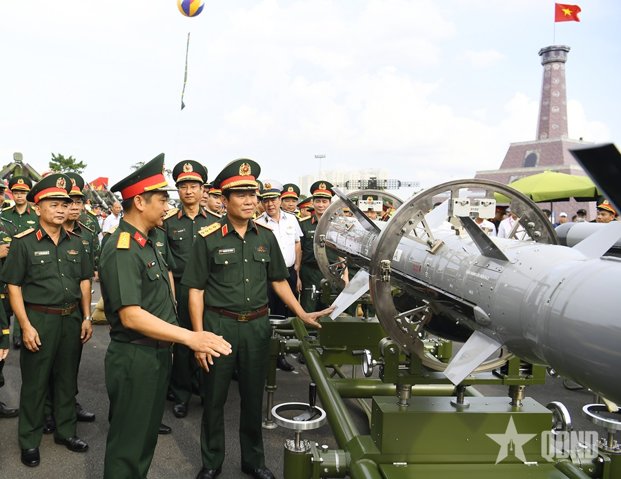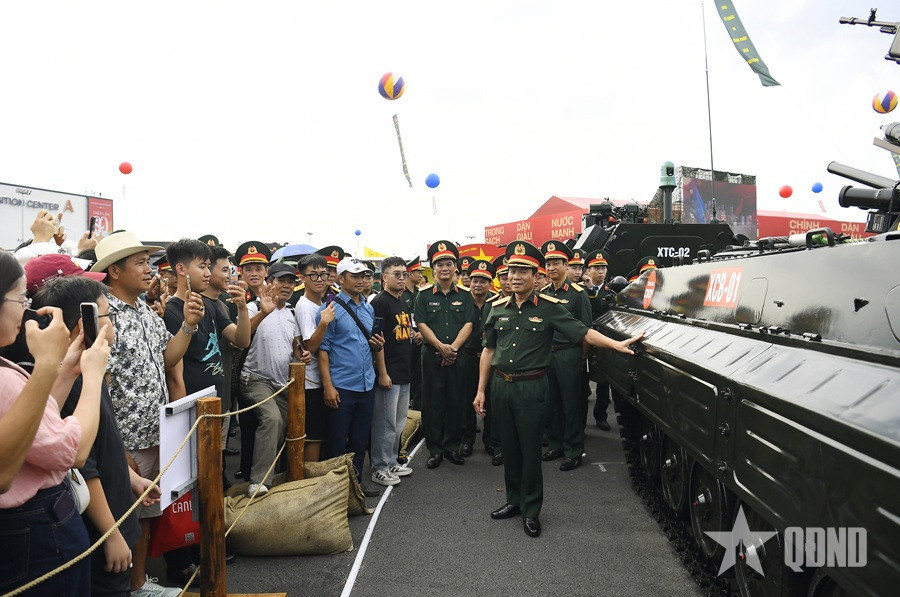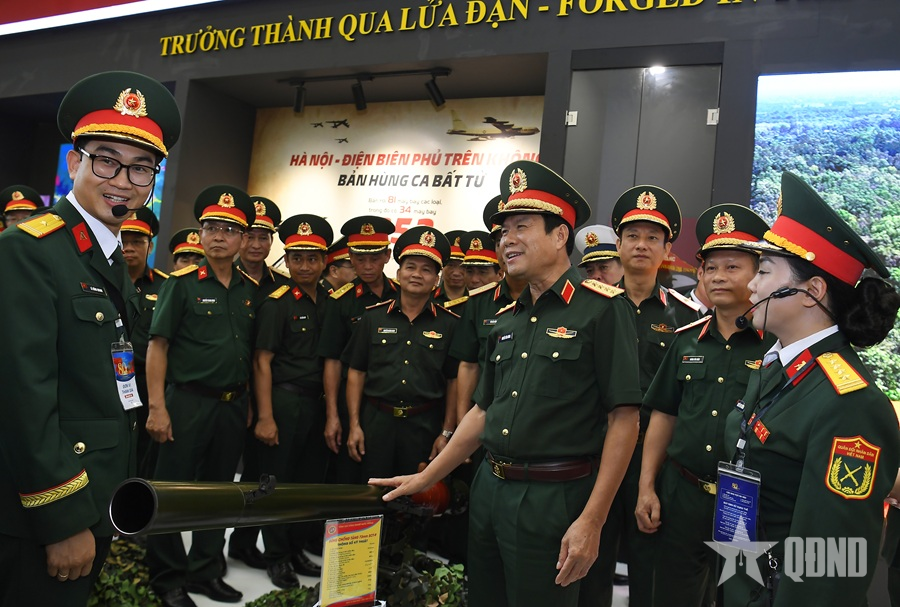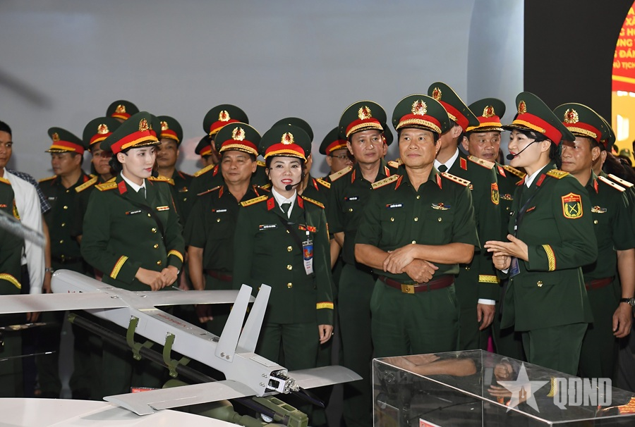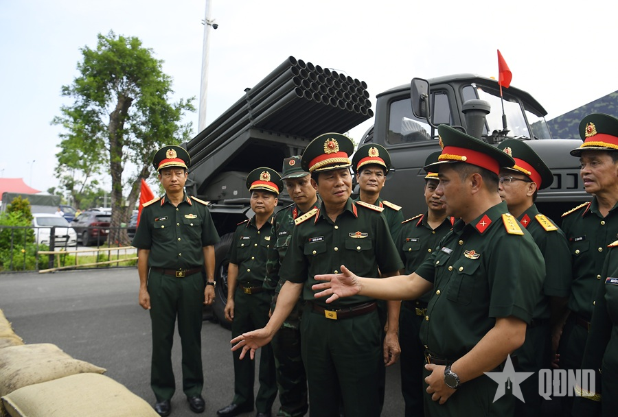 Đại tướng Nguyễn Tân Cương kiểm tra khu vực trưng bày của Bộ Quốc phòng tại Triển lãm thành tựu đất nước "80 năm hành trình Độc lập - Tự do - Hạnh phúc", tháng 9-2025. Ảnh: TUẤN HUY