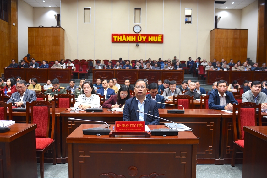 Tại điểm cầu Thành ủy Huế có Phó Bí thư Thường trực Thành ủy Phạm Đức Tiến và các đồng chí trong Thường trực, Ủy viên UBKT Thành ủy; Bí thư, Phó Bí thư các tổ chức đảng trực thuộc Thành ủy.