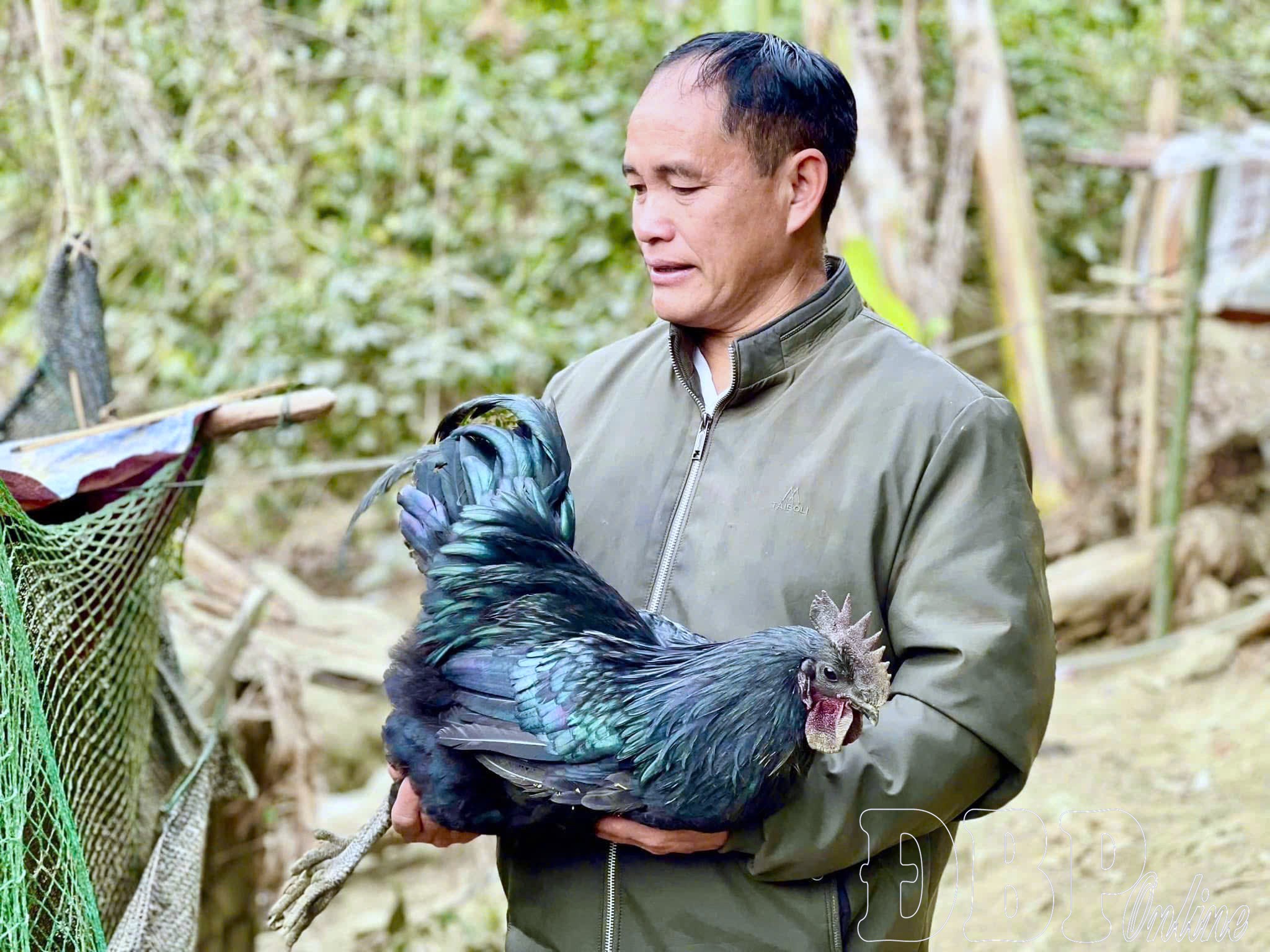 Ông Lý Giống Khá, Bí thư Chi bộ bản Tát Hẹ, xã Mường Ảng giới thiệu giống gà của dự án.