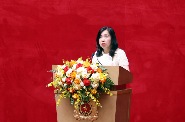 Thứ trưởng Bộ Ngoại giao Lê Thị Thu Hằng trình bày tham luận "Đối ngoại đa phương và hội nhập quốc tế trên lĩnh vực ANTT: thành tựu, những vấn đề đặt ra và phương hướng triển khai trong kỷ nguyên mới".