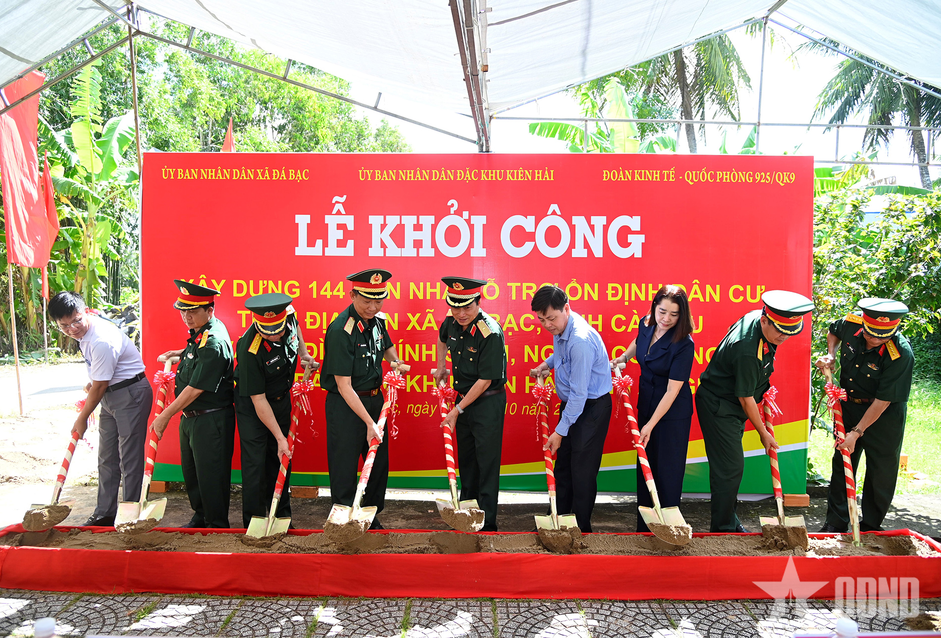 Thủ trưởng Bộ tư lệnh Quân khu 9 thực hiện nghi thức động thổ khởi công xây dựng 144 căn nhà hỗ trợ ổn định dân cư tại xã Đá Bạc, Cà Mau.