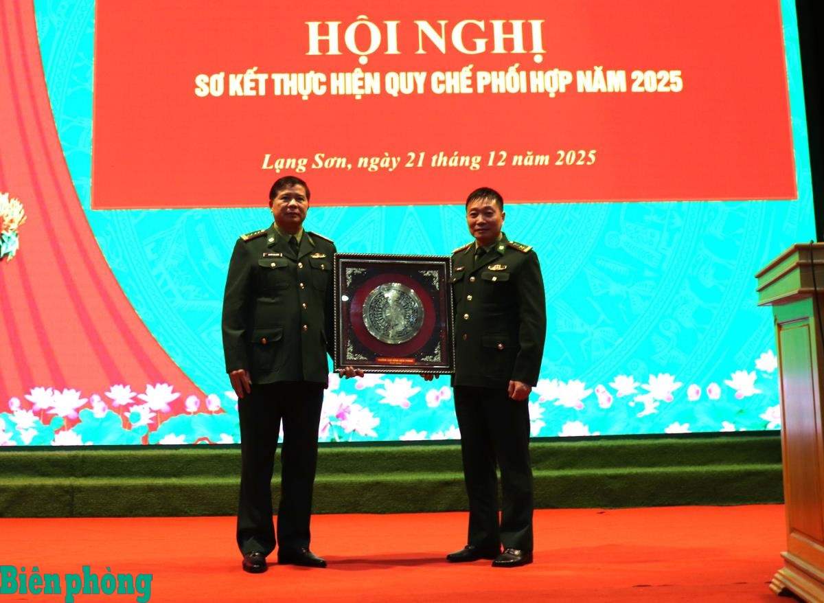 Đại diện Trường CĐBP tặng quà lưu niệm cho Bộ đội Biên phòng tỉnh Lạng Sơn, đơn vị đăng cai tổ chức hội nghị. Ảnh: Viết Lam