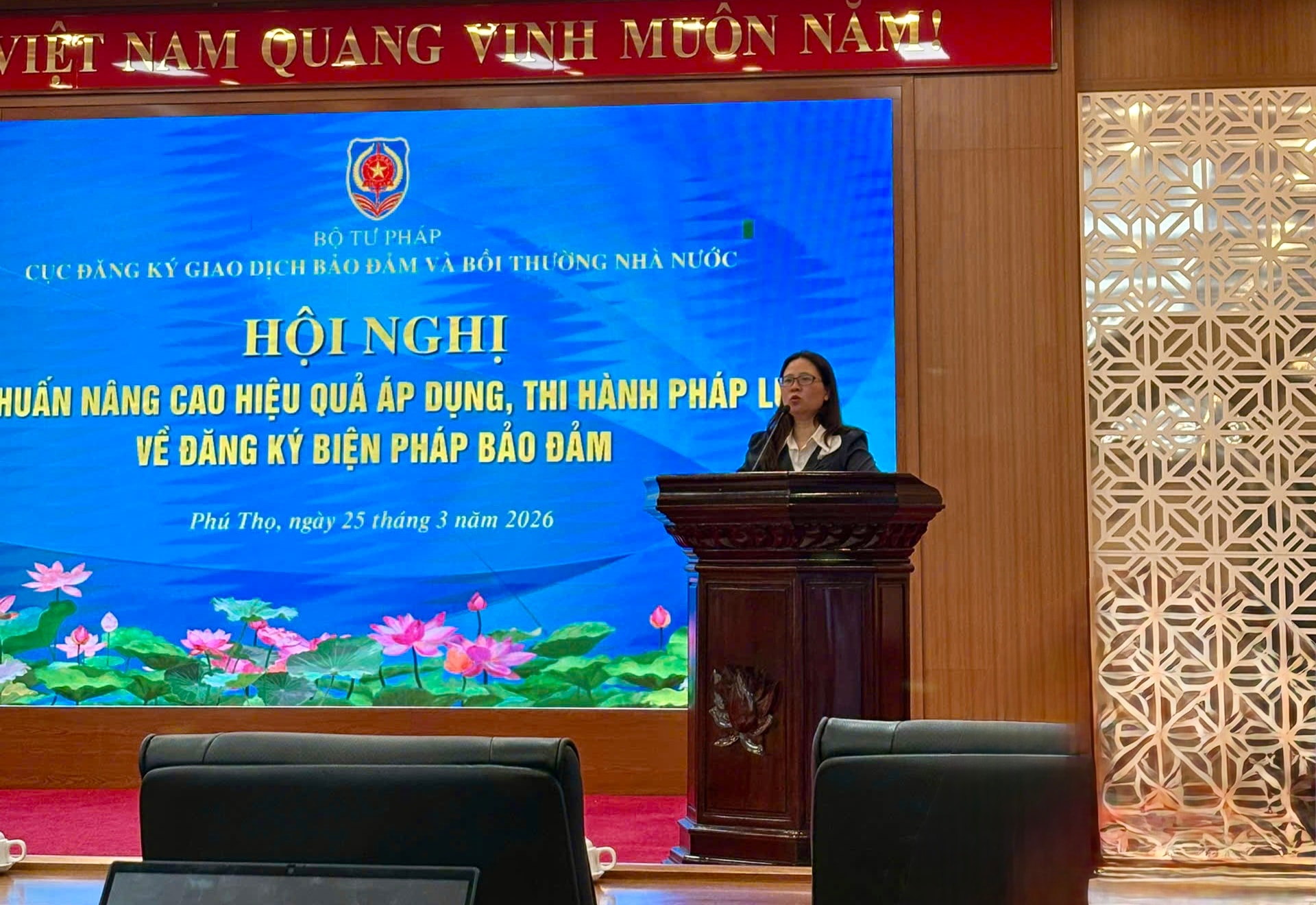 Phát biểu bế mạc hội nghị, Phó Cục trưởng Cục Đăng ký giao dịch bảo đảm và Bồi thường nhà nước Nguyễn Thị Thu Hằng cảm ơn sự phối hợp của Sở Tư pháp tỉnh Phú Thọ và sự tham gia tích cực của đại diện các cơ quan, đơn vị, tổ chức liên quan. Đồng thời khẳng định, hội nghị không chỉ góp phần thống nhất nhận thức, kịp thời tháo gỡ những khó khăn, vướng mắc trong áp dụng, thi hành pháp luật mà còn là kênh thu thập thông tin thực tiễn quan trọng.