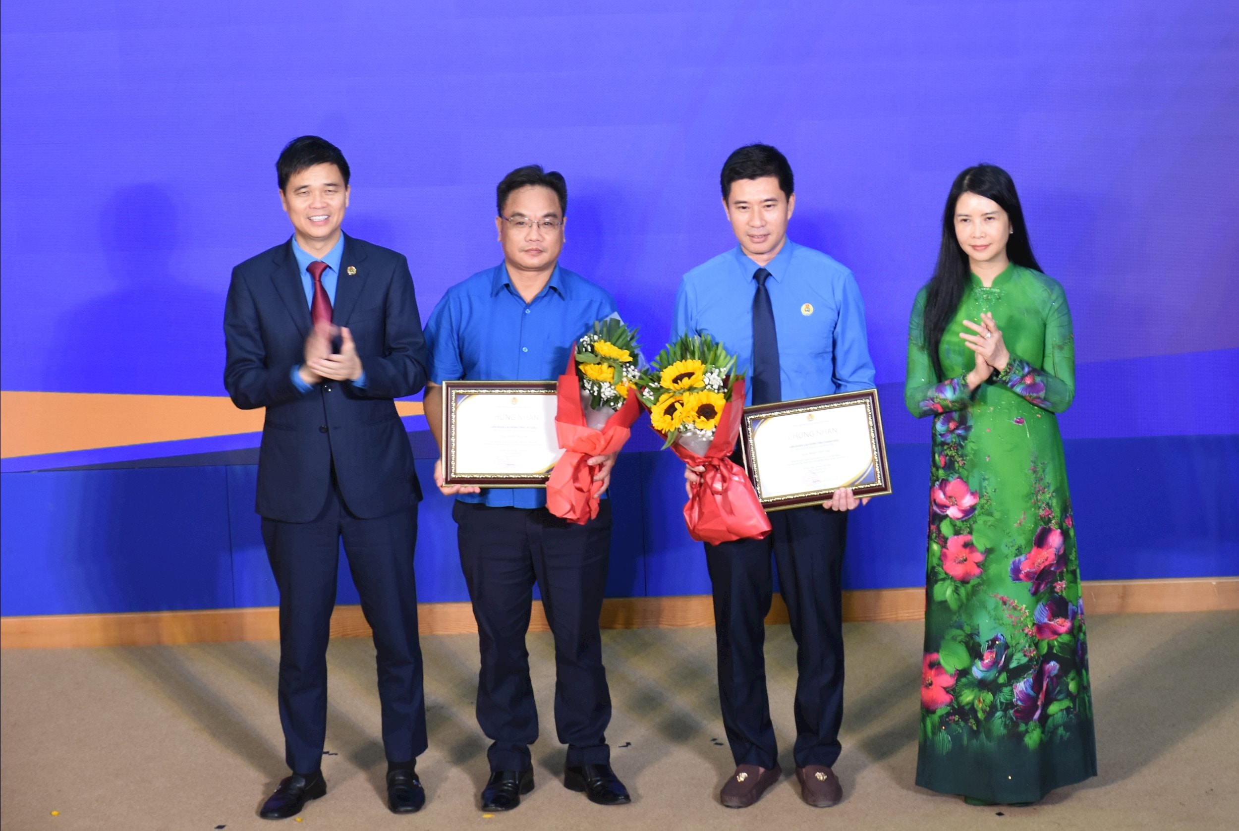 Phó Chủ tịch Tổng LĐLĐ Việt Nam Ngọ Duy Hiểu và Phó Chủ tịch Thường trực Hội Liên hiệp phụ nữ Việt Nam Trần Lan Phương trao giải Nhất tập thể cho 2 đơn vị. Ảnh: Hải Nguyễn