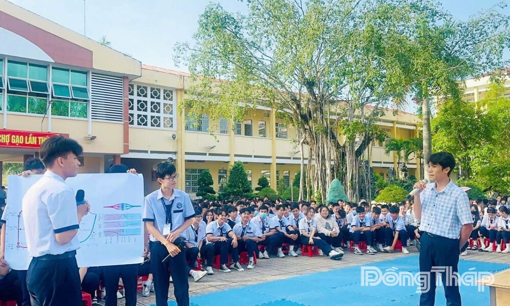 Một trong những hoạt động nổi bật là phần thi hùng biện. Học sinh trực tiếp trình bày quan điểm, chia sẻ trải nghiệm và cách vượt qua rào cản tâm lý.