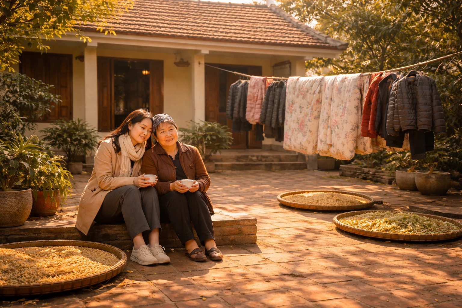 Tôi nhìn dáng mẹ cần mẫn cào đi, cào lại mấy nia đậu, nia lạc bằng đôi bàn tay gầy guộc như thể sợ nắng sẽ nhanh vụt chạy đi mất. Thi thoảng mẹ lại đưa tay trở mấy tấm áo cho nắng thấm đều hơn. Tôi hiểu, mẹ đang “nhặt nắng” theo cách của riêng mình, gom từng tia nhỏ bé để khâu lại thành hơi ấm cho cả gia đình. Hơi ấm ấy không chỉ nằm trong những tấm áo, chiếc chăn, mà còn nằm trong sự tảo tần, trong tình yêu thương thầm lặng mà mẹ dành cho chúng tôi.