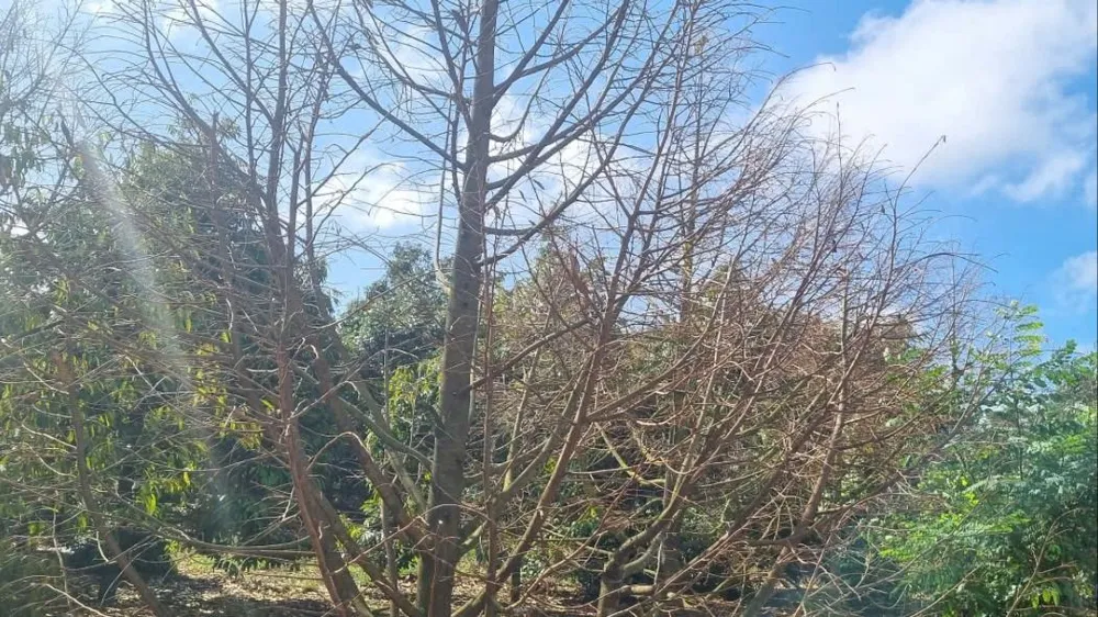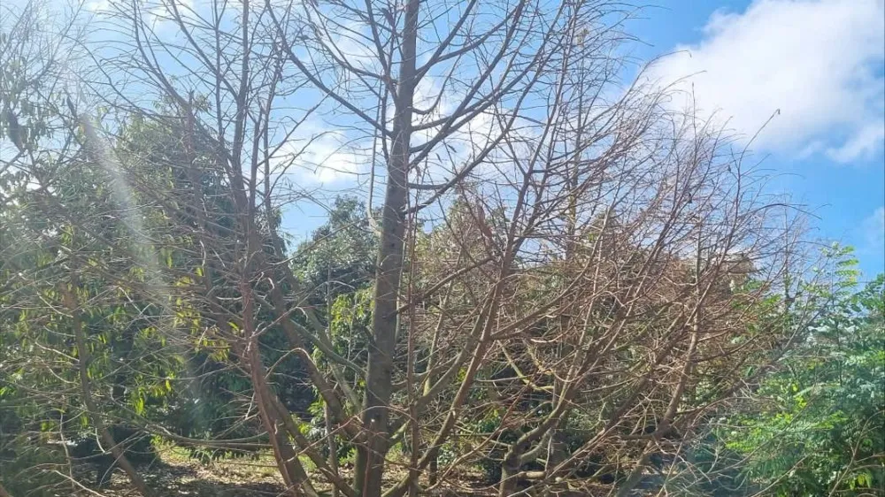 Tại vườn sầu riêng của ông Hà, PLO ghi nhận hàng chục cây sầu riêng (đã trồng khoảng 7 năm) đã trụi lá, khô cành hoàn toàn. Ngoài ra, những hàng sầu riêng được trồng gần bờ hồ cũng đang héo lá, có dấu hiệu chết dần.