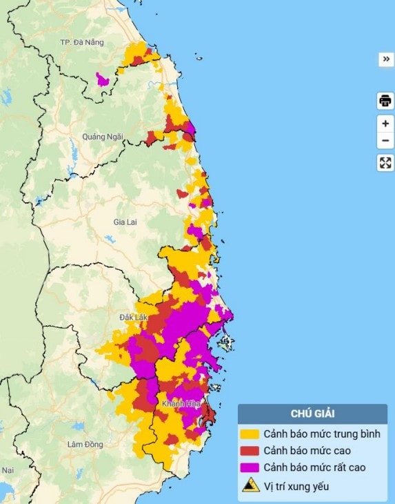 Trong 6 giờ tới, nguy cơ xảy ra lũ quét trên các sông, suối nhỏ, sạt lở đất trên sườn dốc tại nhiều xã/phường. Trong đó cấp độ rủi ro thiên tai do lũ quét, sạt lở đất, sụt lún đất do mưa lũ hoặc dòng chảy thuôc cấp 1; Khánh Hòa, Đắk Lắk thuộc cấp 2.
