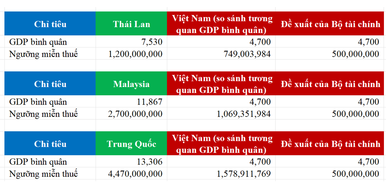 Cụ thể, nếu so sánh tương quan với Thái Lan thì mức doanh thu miễn thuế mà chúng ta nên cân nhắc là 750 triệu đồng (nhưng Bộ Tài chính đề xuất 500 triệu đồng). Hay so với Malaysia, ngưỡng doanh thu Việt Nam nên cân nhắc là 1 tỉ đồng. Nếu so với Trung Quốc, ngưỡng doanh thu Việt Nam nên cân nhắc là 1,5 tỉ đồng.