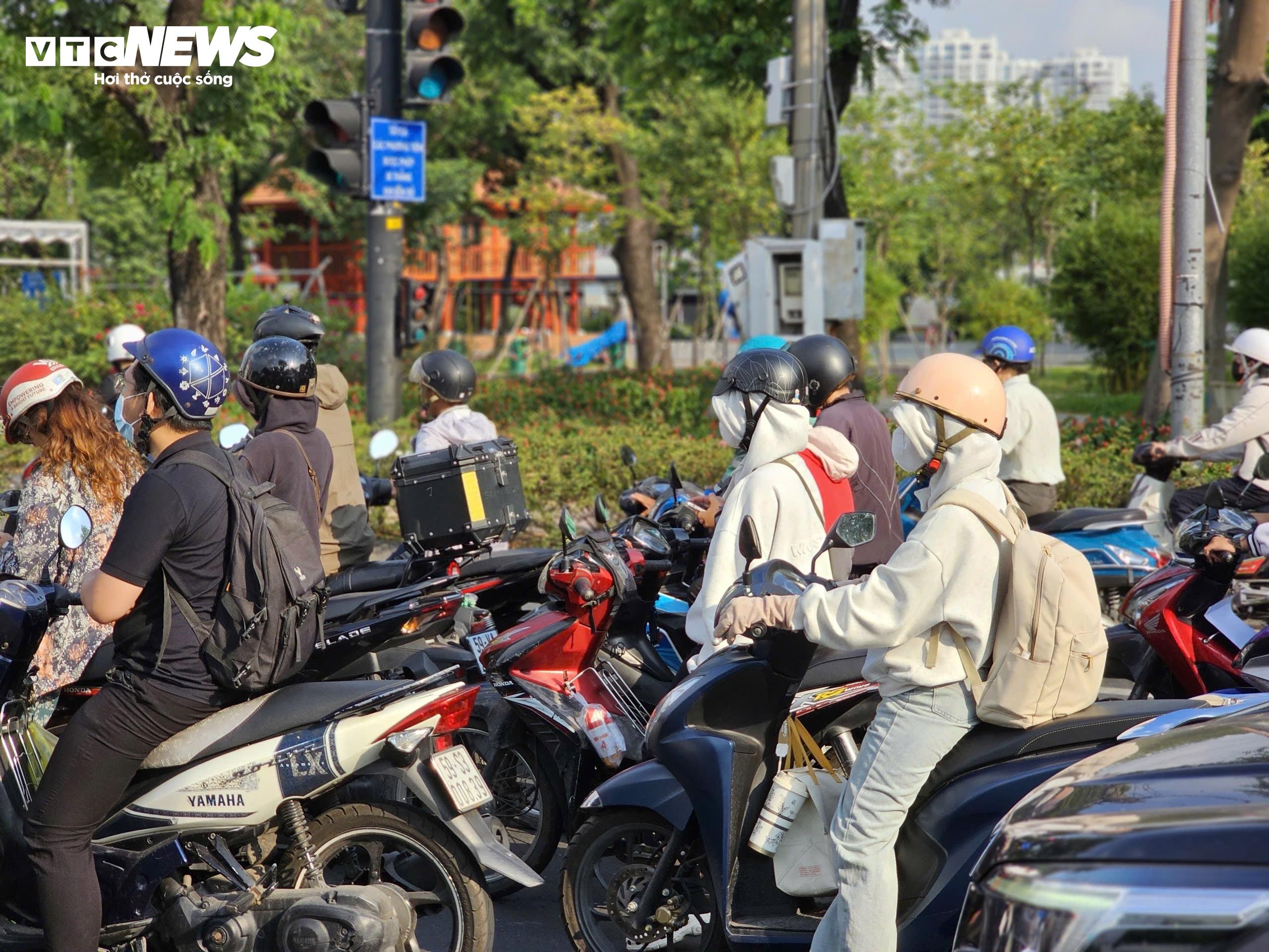 Người dân TP.HCM trùm kín áo chống nắng, khẩu trang khi di chuyển dưới thời tiết oi bức từ sáng sớm.