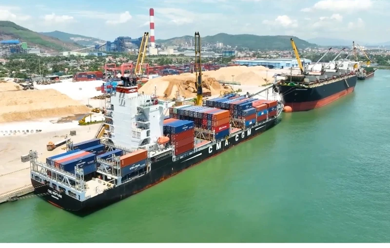 Chính sách từ Nghị quyết số 248/2022/NQ-HĐND ngày 13/7/2022 của HĐND tỉnh hiện đã thu hút 3 hãng tàu mở tuyến container quốc tế và nội địa tại Cảng Nghi Sơn. (Trong ảnh: Hãng tàu CMA-CGM bốc xếp hàng hóa container đưa đi xuất khẩu). Ảnh: Minh Tuyết