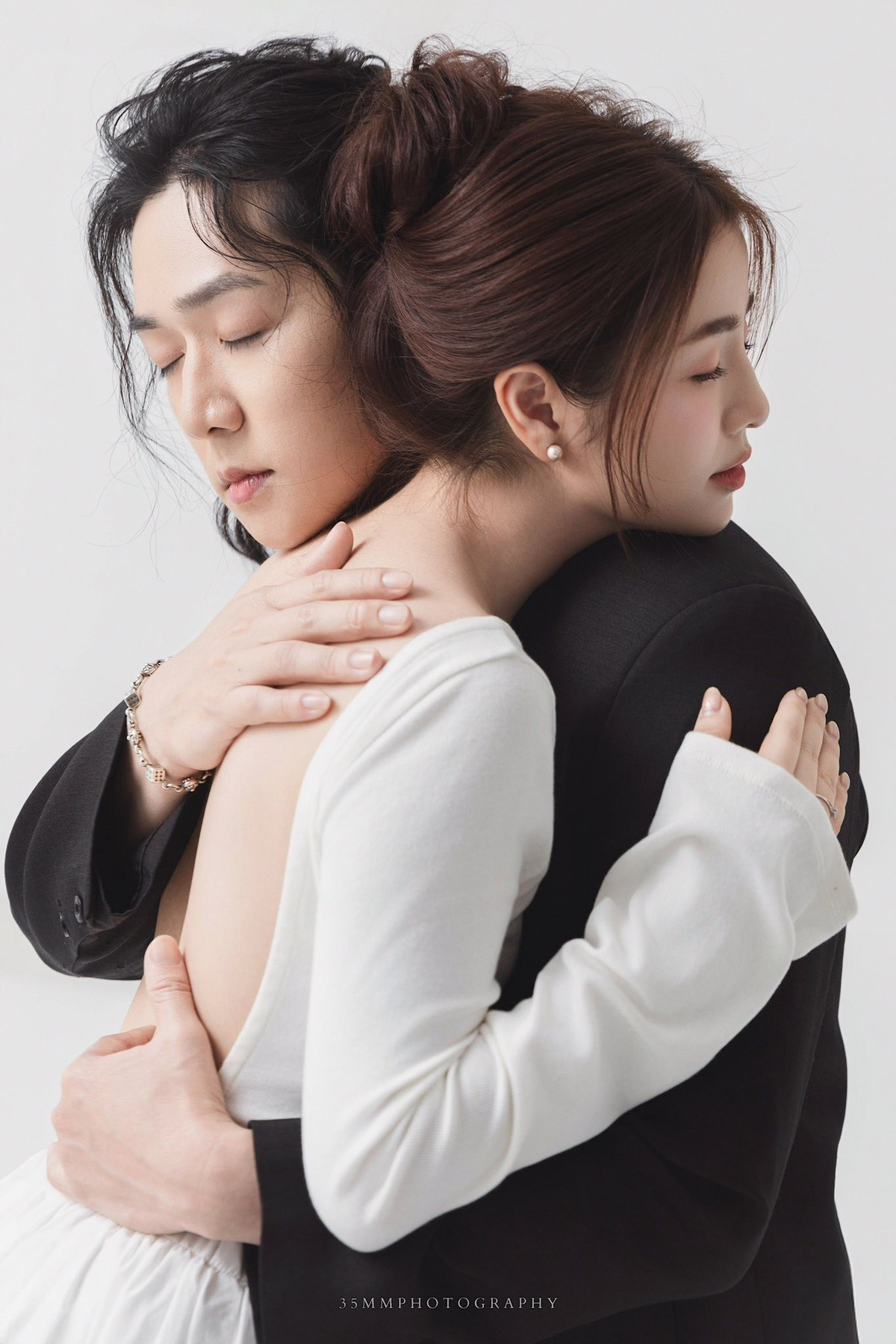 Bên cạnh "nàng thơ", Ba Duy cũng xuất hiện đầy lịch lãm với trang phục vest đen, mái tóc lãng tử, tạo nên một tổng thể hài hòa và đậm chất điện ảnh. Mọi cử chỉ tình cảm mà cả hai trao cho nhau đều toát lên sự gắn kết và viên mãn hiếm có. (Ảnh: FB Nguyễn Nam Thương)