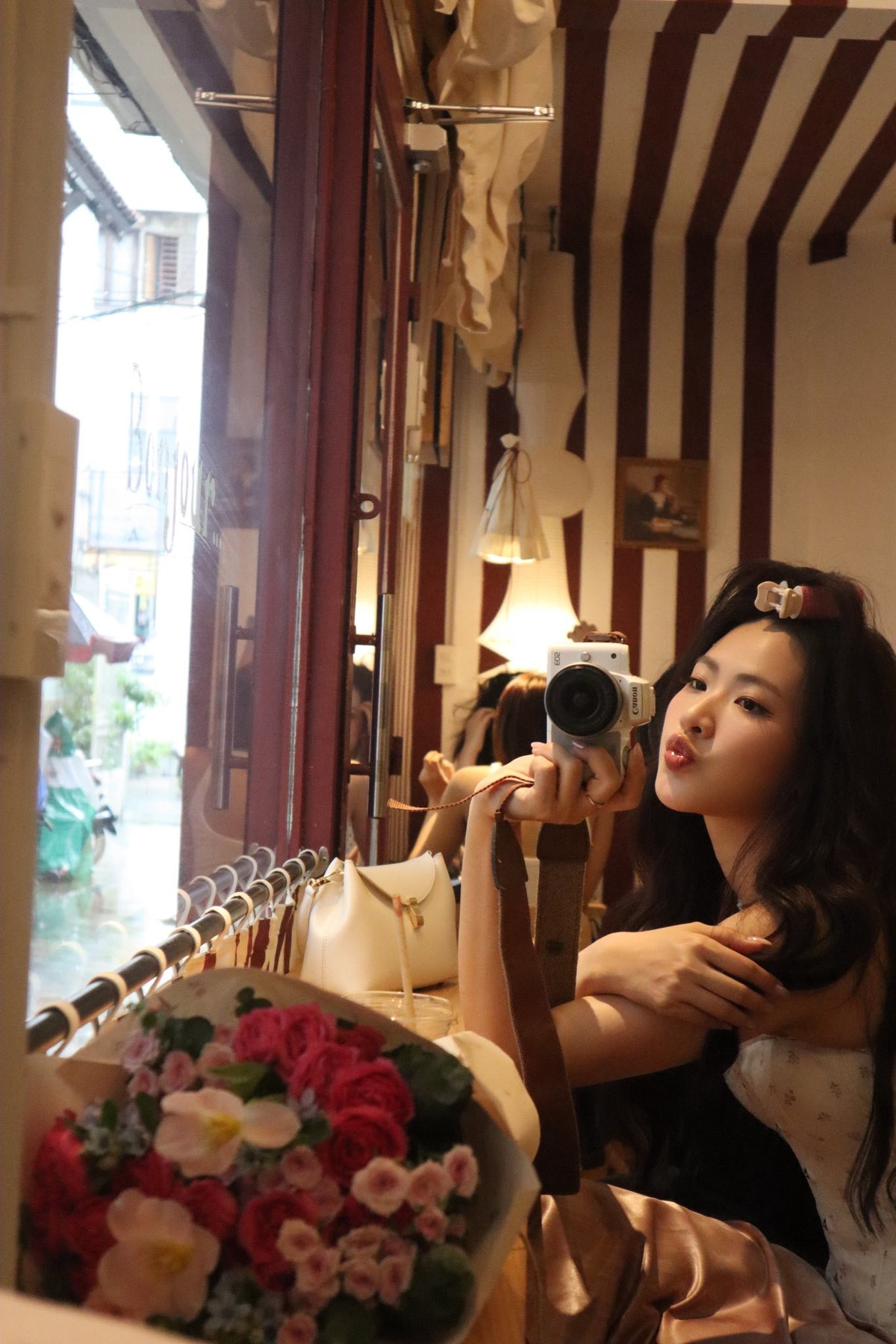 Khoảnh khắc cô nàng tạo dáng bên bó hoa hồng lãng mạn, hay tự chụp ảnh selfie qua gương với chiếc máy ảnh nhỏ gọn càng làm nổi bật vẻ đẹp thanh thoát, ngọt ngào. (Ảnh: FBNV)