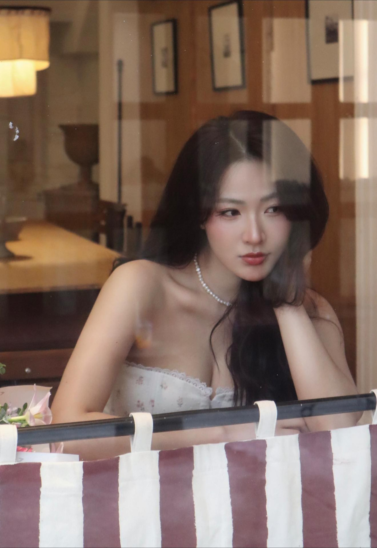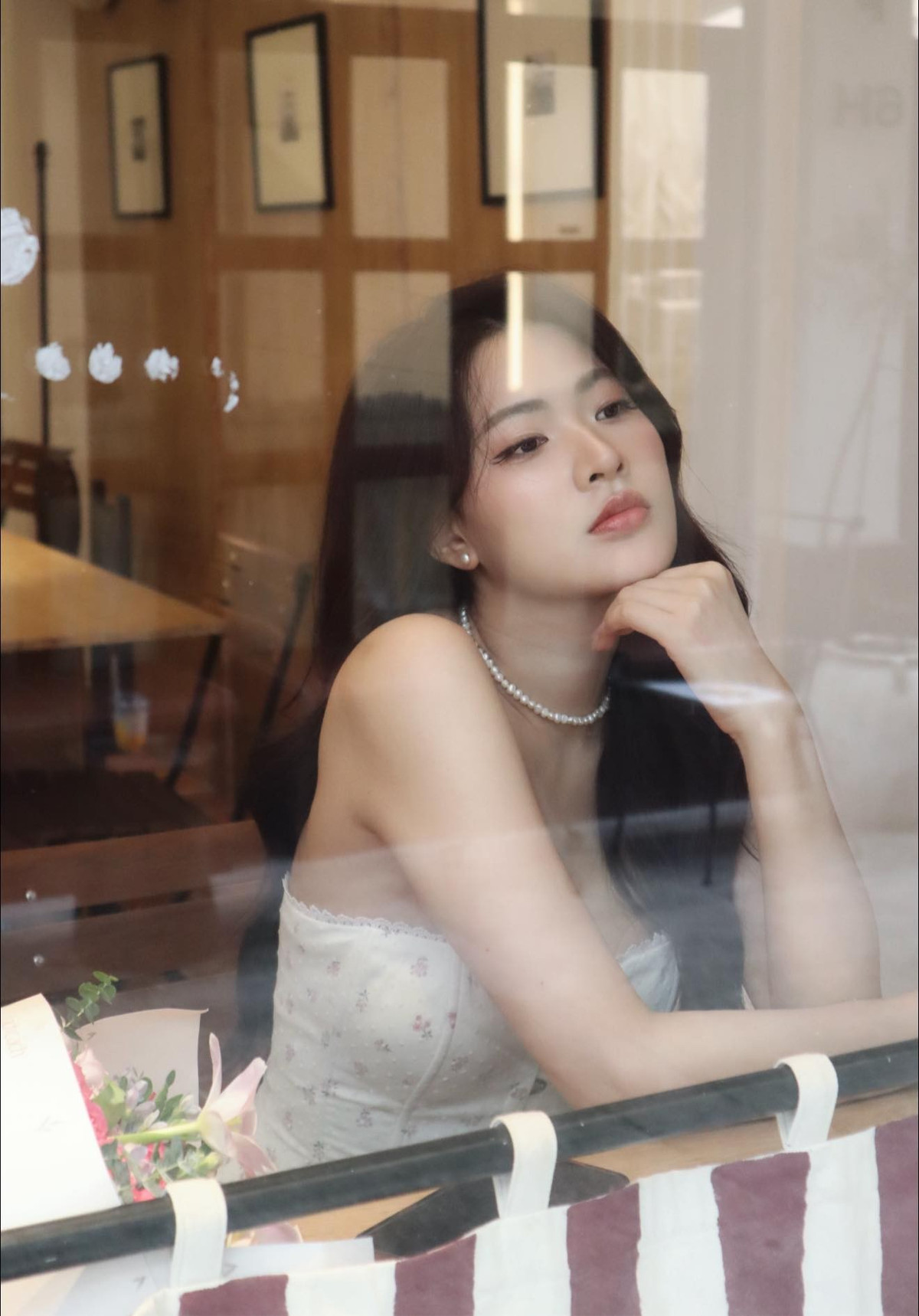 Những bức ảnh được chụp tại một quán cà phê mang phong cách retro, với những chi tiết sọc đỏ trắng và ánh sáng ấm áp, càng làm tăng thêm không khí mơ màng, lãng mạn. (Ảnh: FBNV)