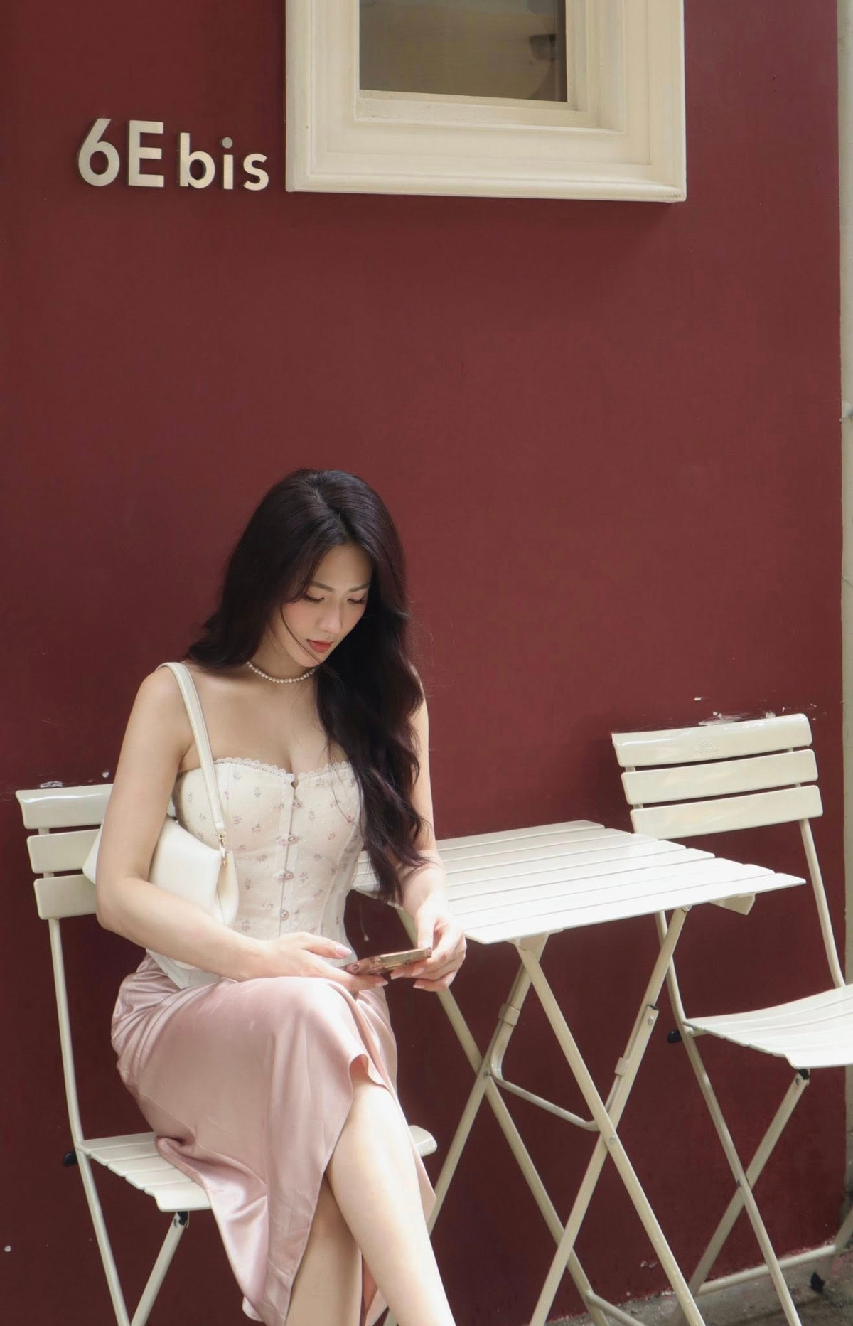 Cô diện chiếc áo corset trắng họa tiết hoa nhí kết hợp cùng chân váy lụa màu hồng pastel, tạo nên một tổng thể hài hòa, cổ điển và không kém phần quyến rũ. (Ảnh: FBNV)
