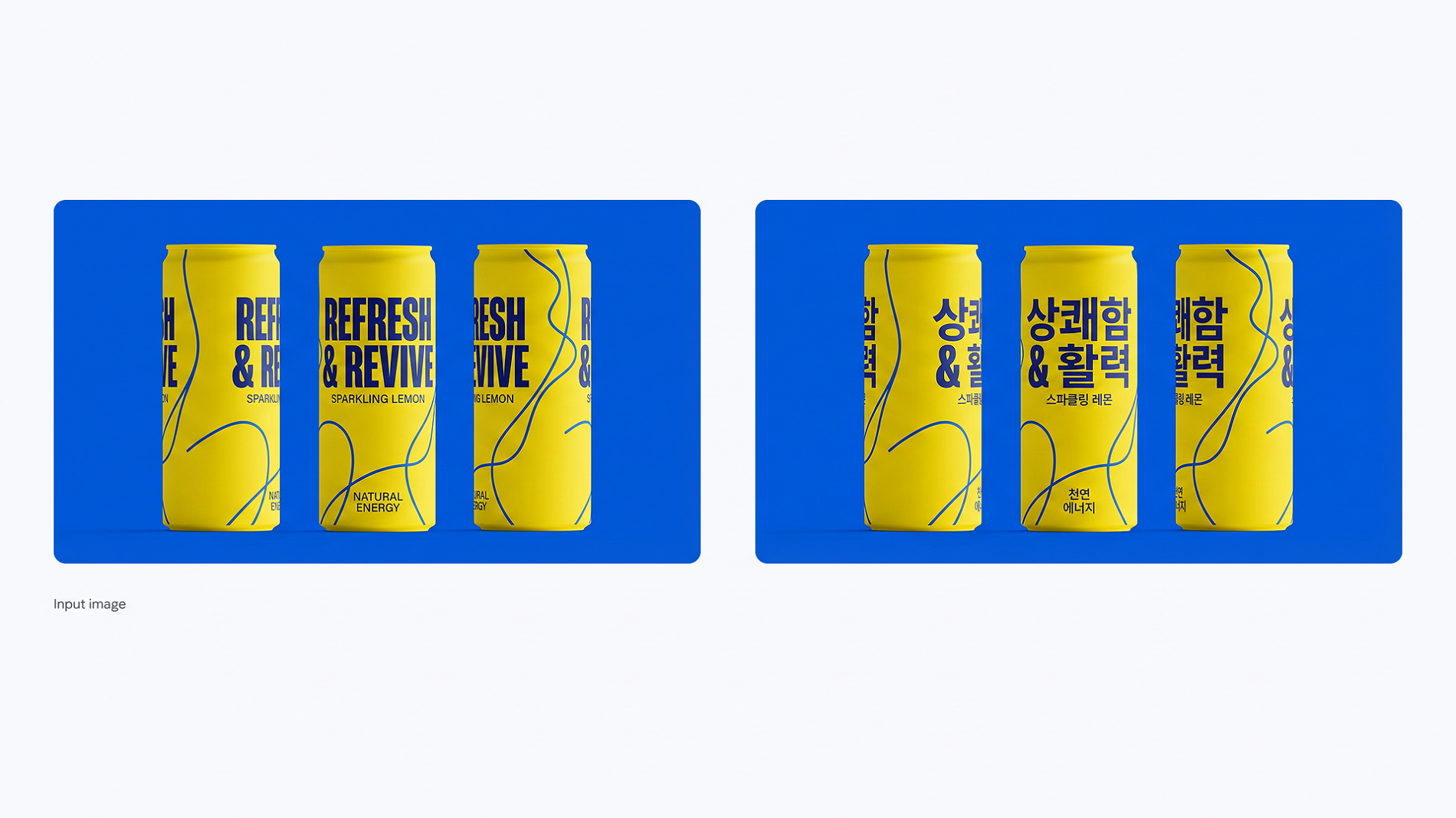 Prompt: Dịch toàn bộ phần chữ tiếng Anh trên ba lon màu vàng và xanh sang tiếng Hàn, giữ nguyên mọi chi tiết còn lại.