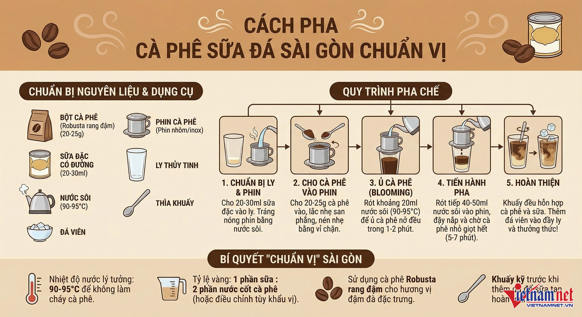 Hình ảnh do Nano Banana Pro tạo với prompt: Tạo một infographic minh họa cách pha cafe sữa đá Sài Gòn bằng tiếng Việt, lưu ý đúng chính tả.