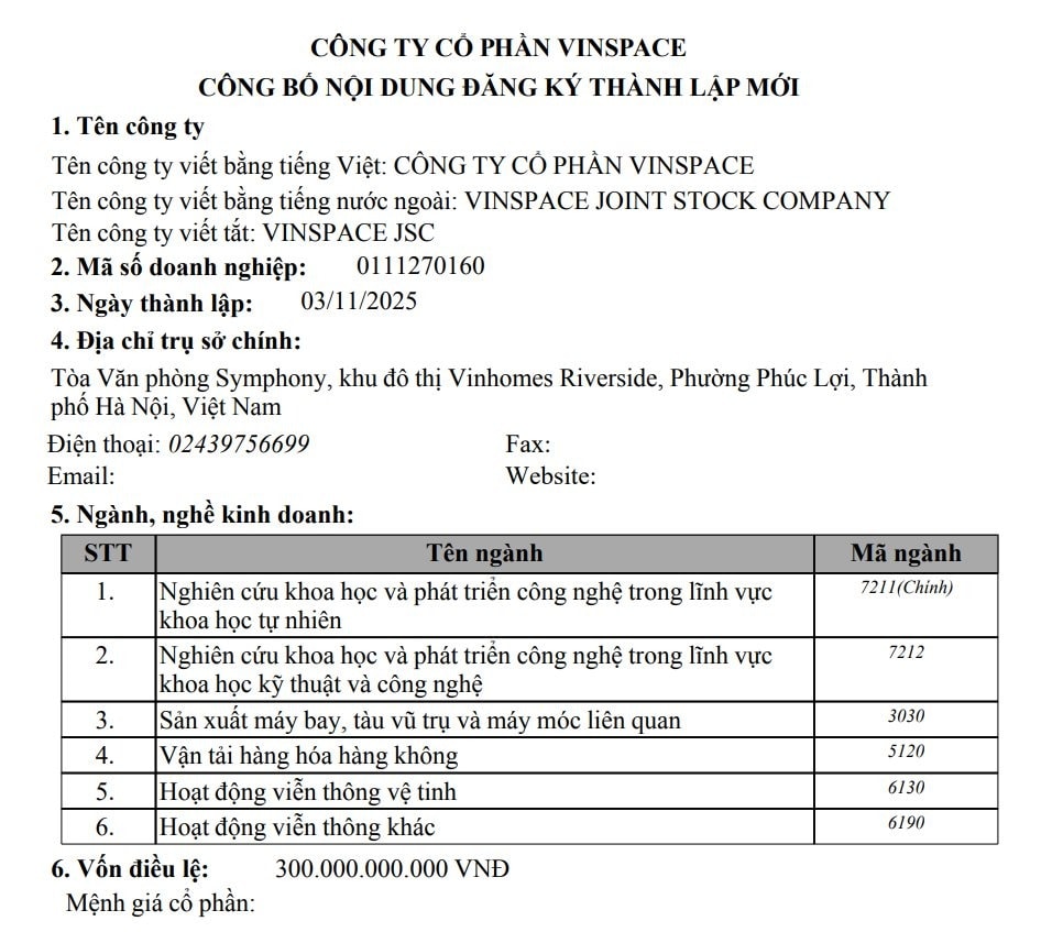 Công ty cổ phần VinSpace, được thành lập ngày 3.11.2025 với vốn điều lệ 300 tỉ đồng, là dự án mới nhất trong hệ sinh thái của Tập đoàn Vingroup và gia đình tỷ phú Phạm Nhật Vượng.